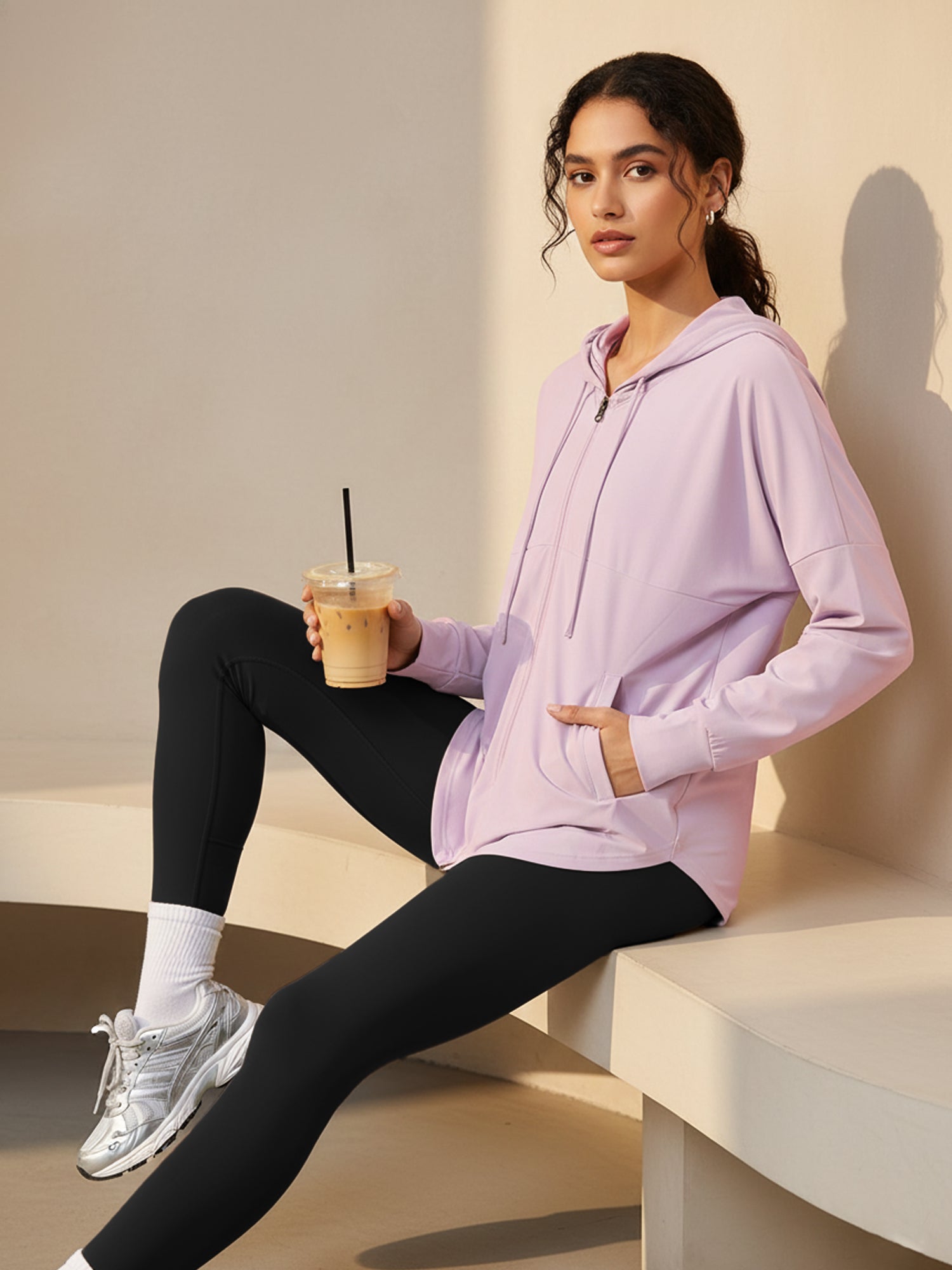 A soft blend of comfort and confidence — this pastel lavender hoodie jacket is made for everything from warm-up sessions to coffee runs. Featuring a sleek front zipper, subtle self-texture, and functional side pockets, it pairs everyday ease with a refined, active look. The lightweight stretch fabric keeps you comfortable while maintaining its shape through every move.