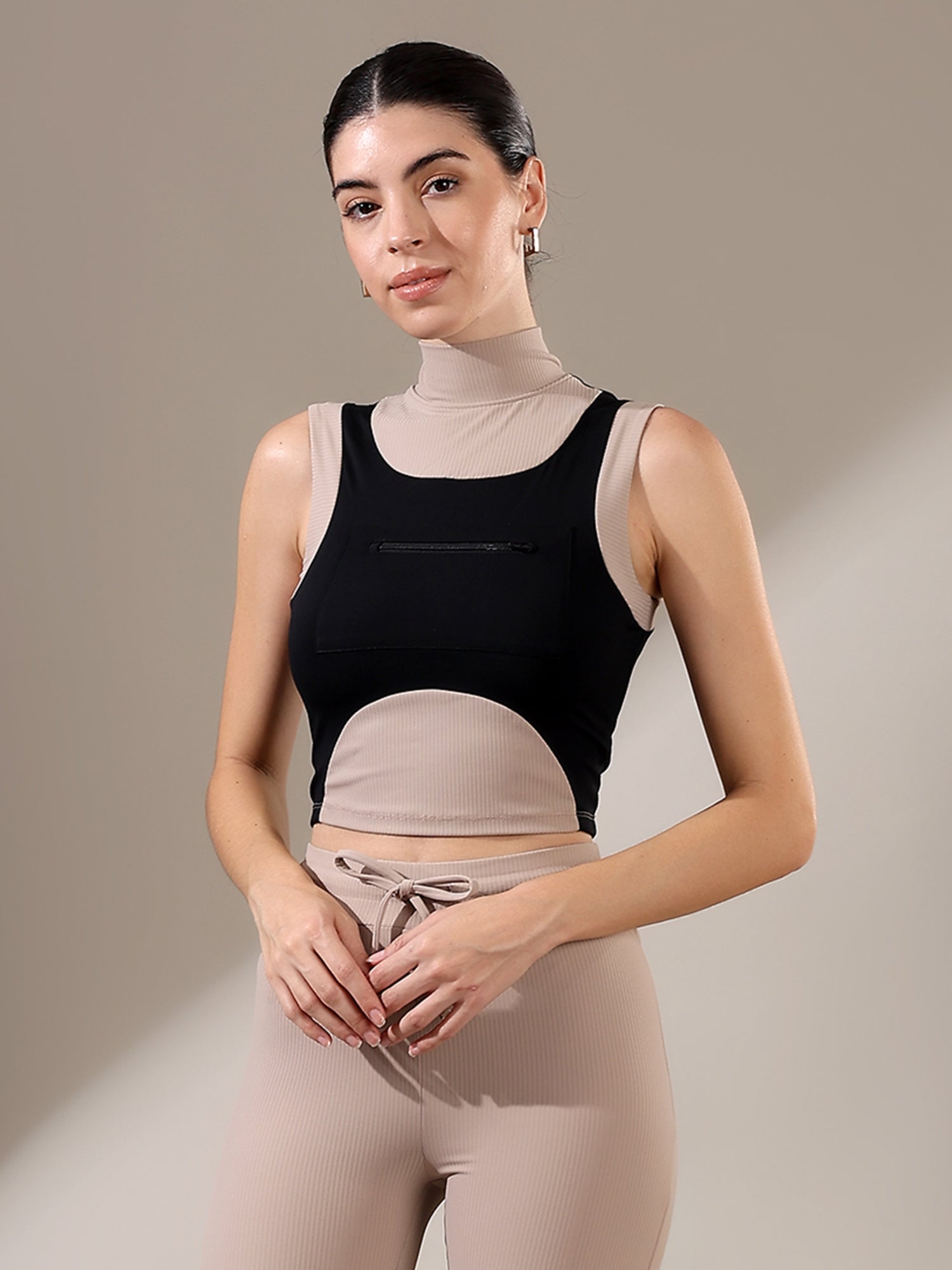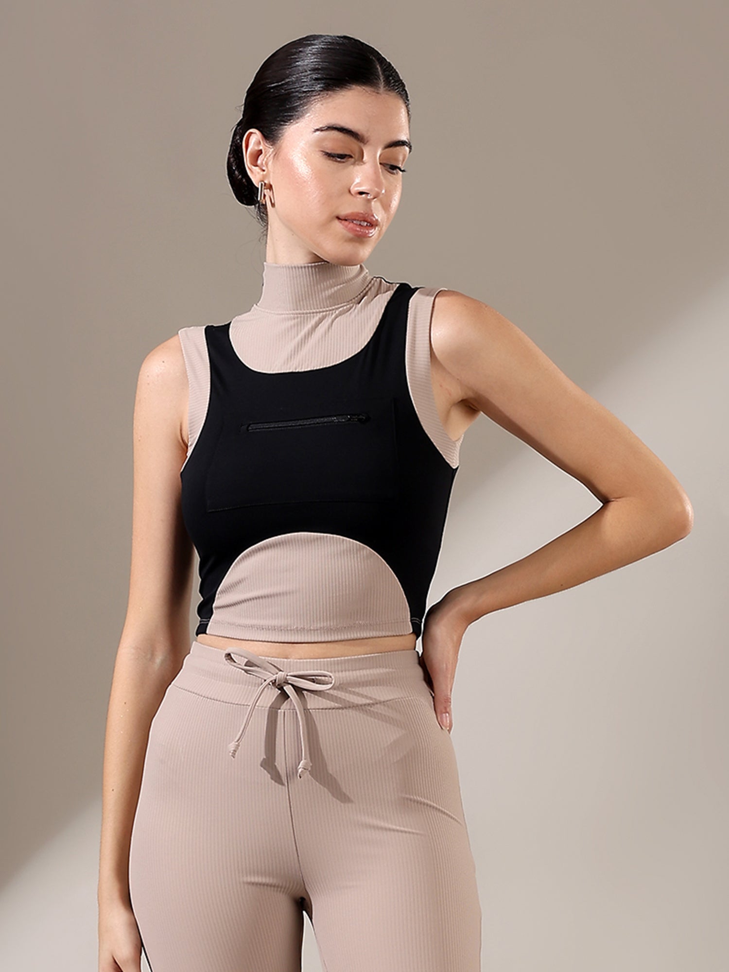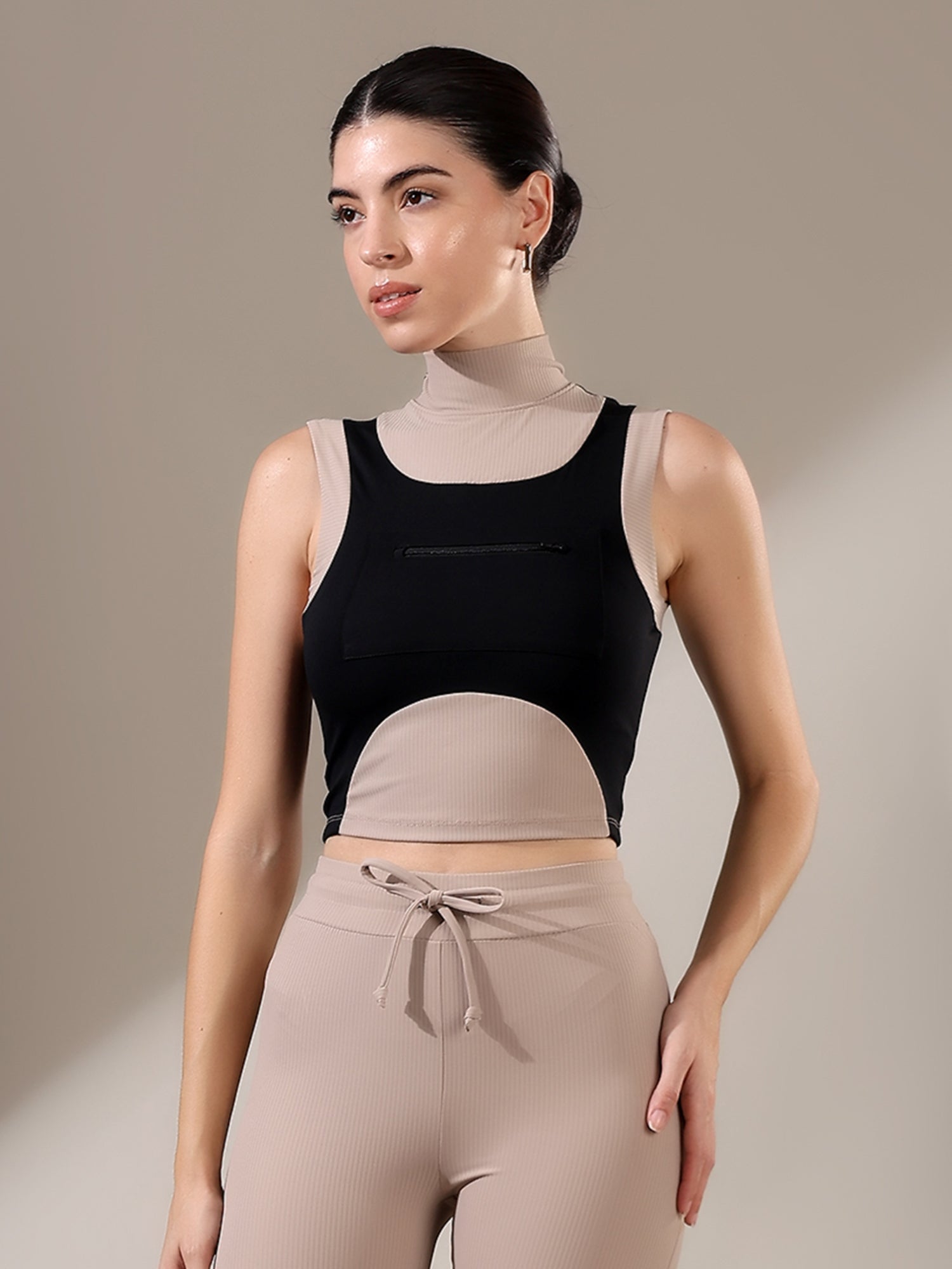 The Fitkin Beige Colorblock Ribbed Top blends bold style with everyday comfort, featuring ribbed texture and breathable stretch for all-day ease.