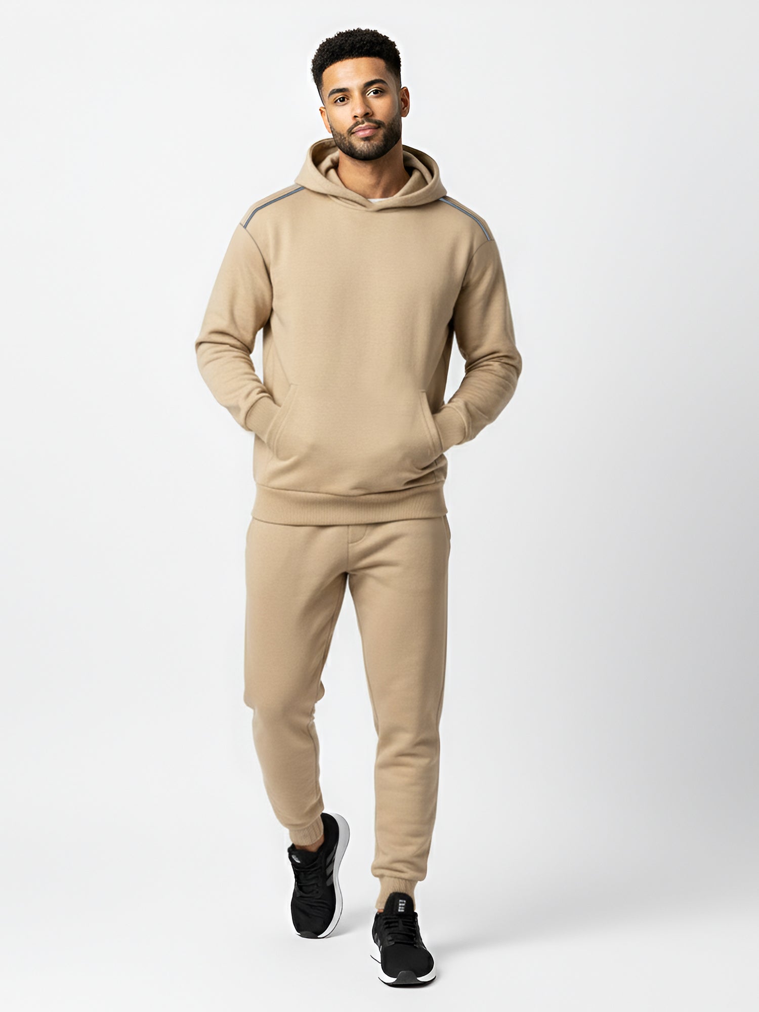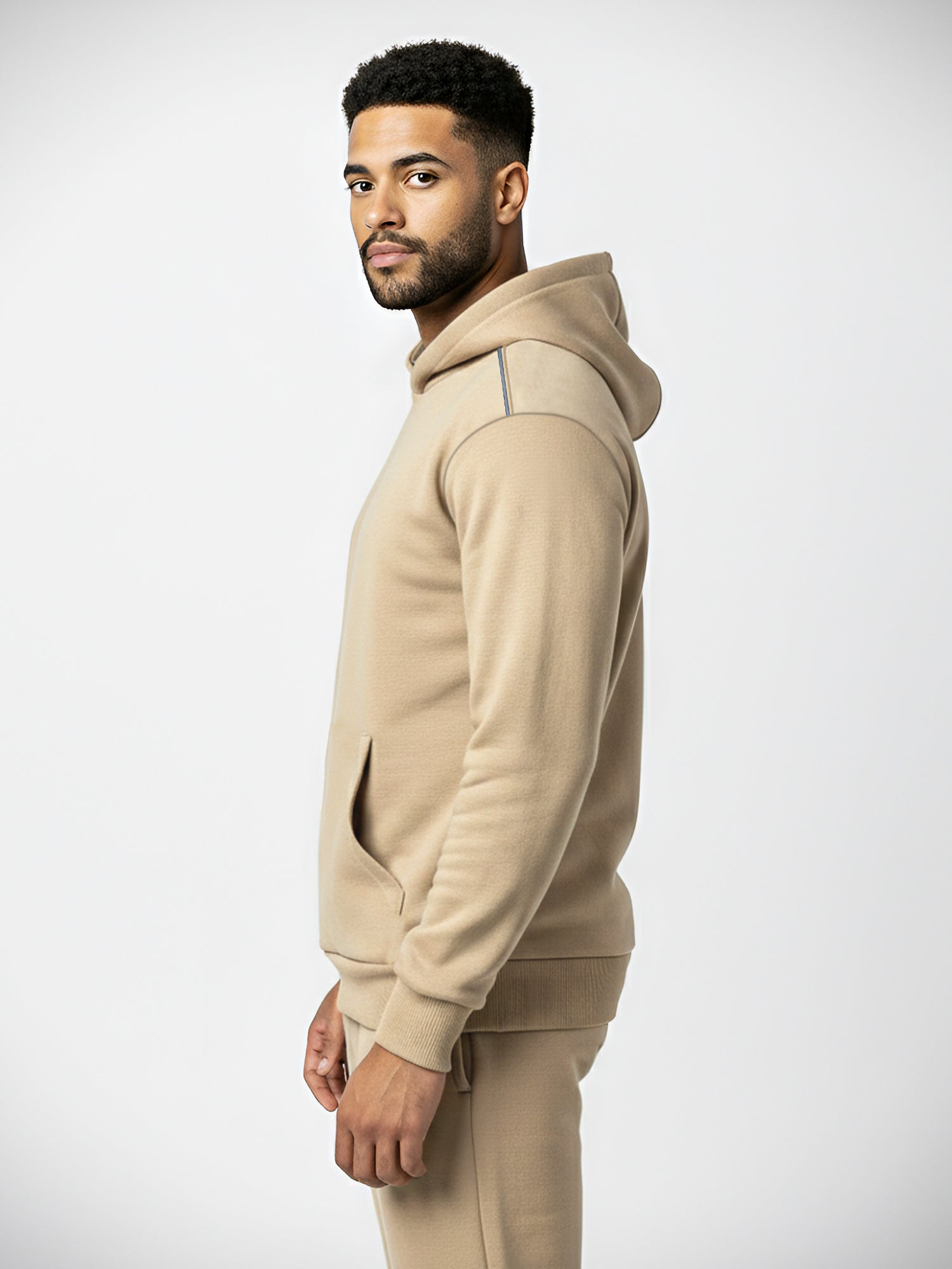 A solid beige men’s fleece hoodie with a clean, athletic edge. The relaxed drop-shoulder fit sits easy on the body, while reflective piping runs from neck to shoulder for a sharp, night-ready detail. Finished with ribbed cuffs and a ribbed bottom hem to hold shape and a roomy front kangaroo pocket for hands and essentials. Built for everyday winter wear, travel and late-evening runs.