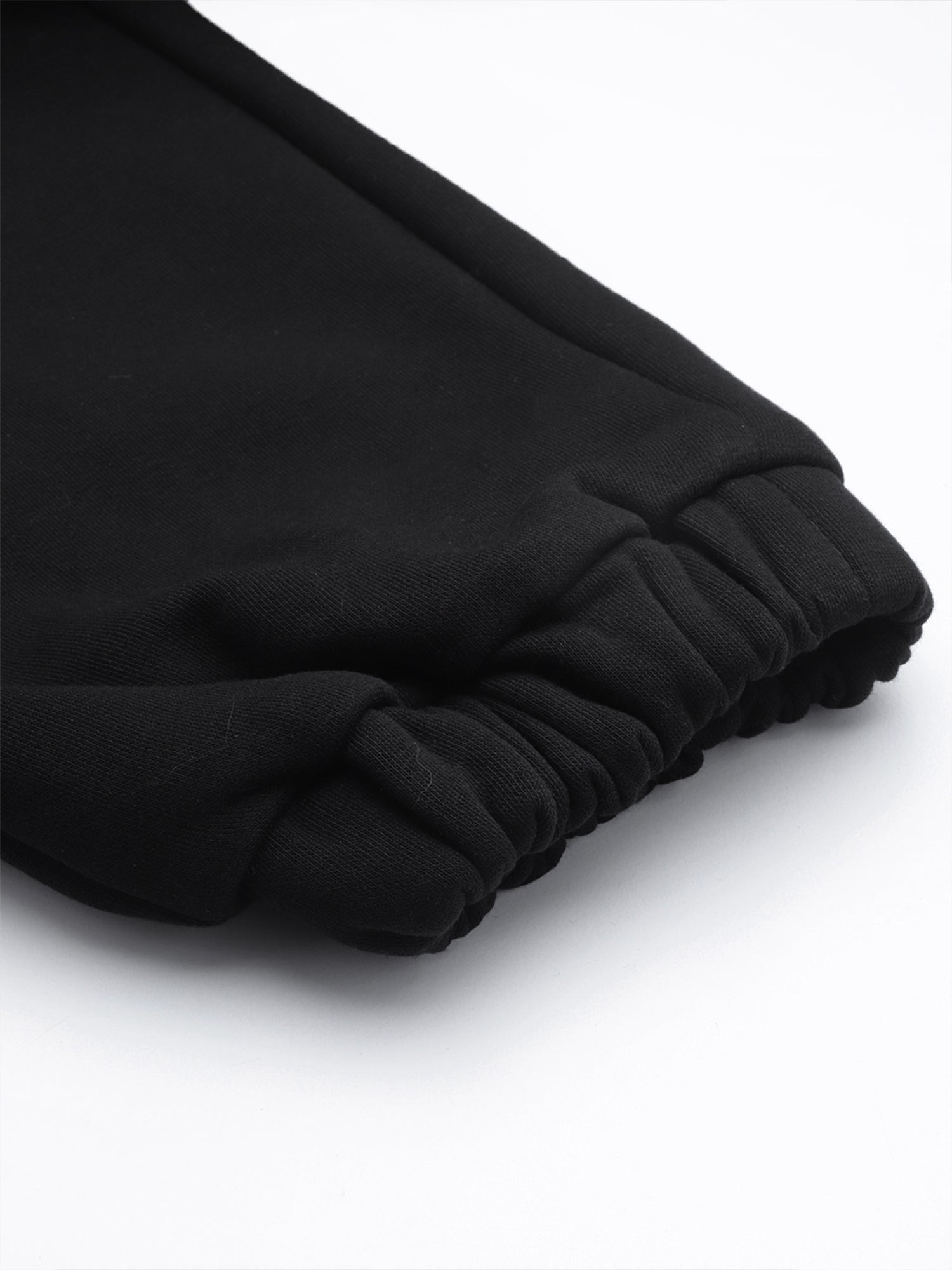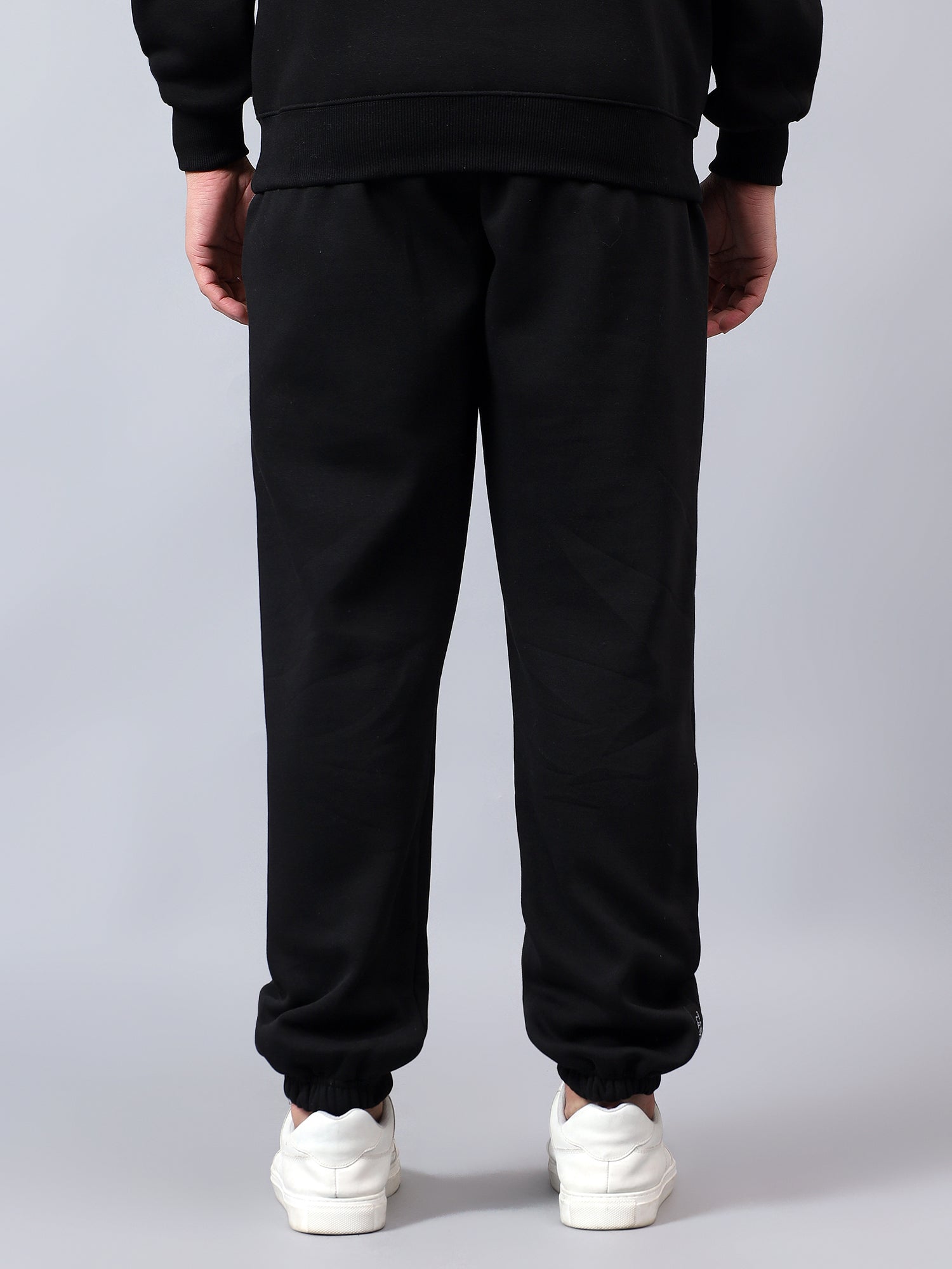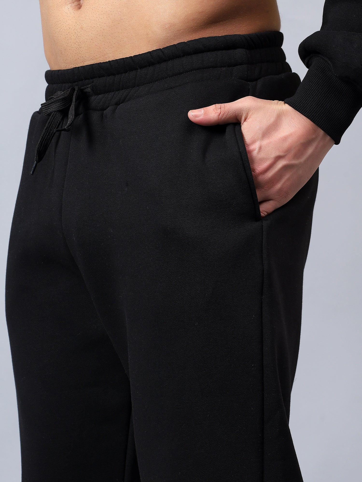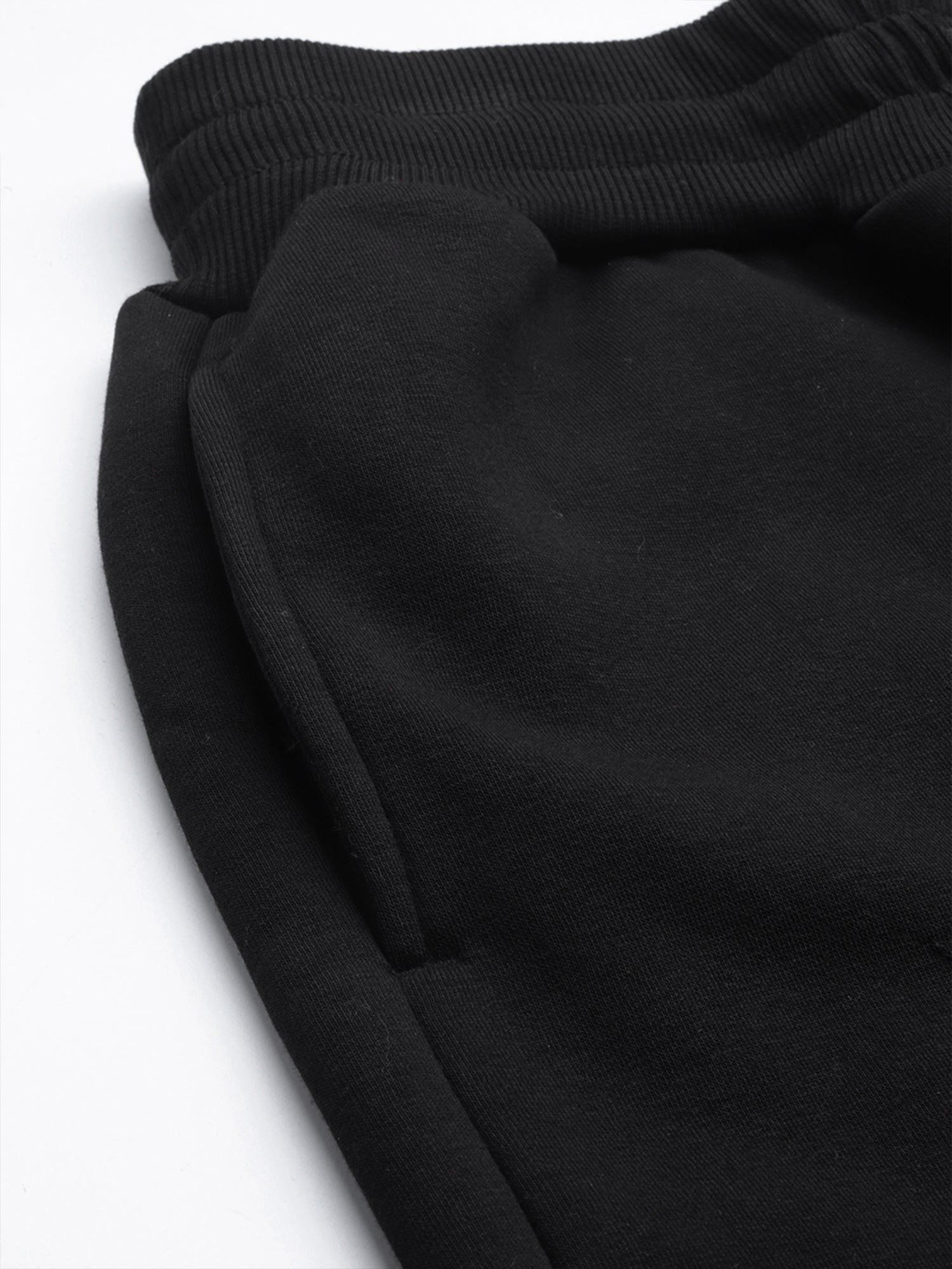 Warm, easy and sharp, these black fleece joggers are built for everyday wear. They come with an elasticated waistband and external drawcord for a secure, adjustable fit, side pockets for your phone and keys, and one clean back pocket for extras. The tapered leg with ribbed cuffs sits neatly over sneakers, making them perfect for travel, lounging or stepping out in a co-ord set with your hoodie.