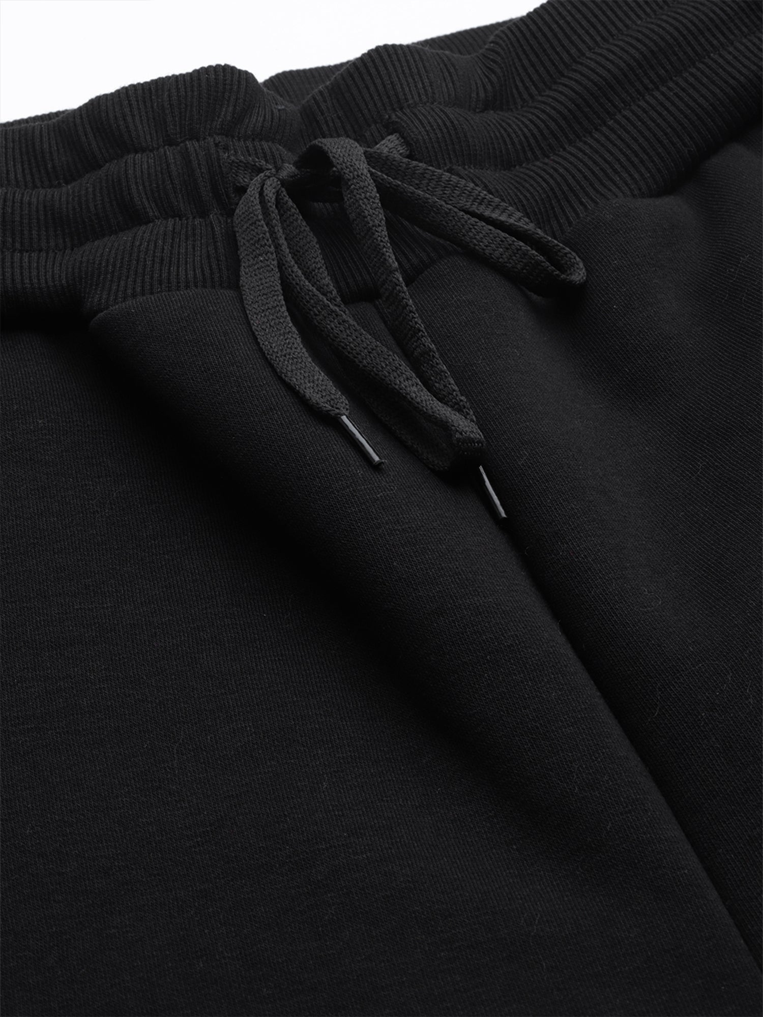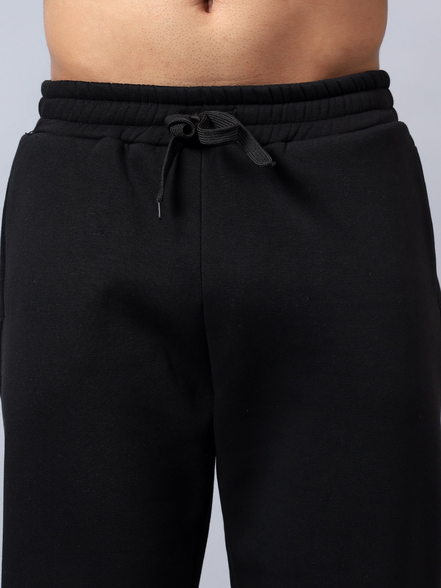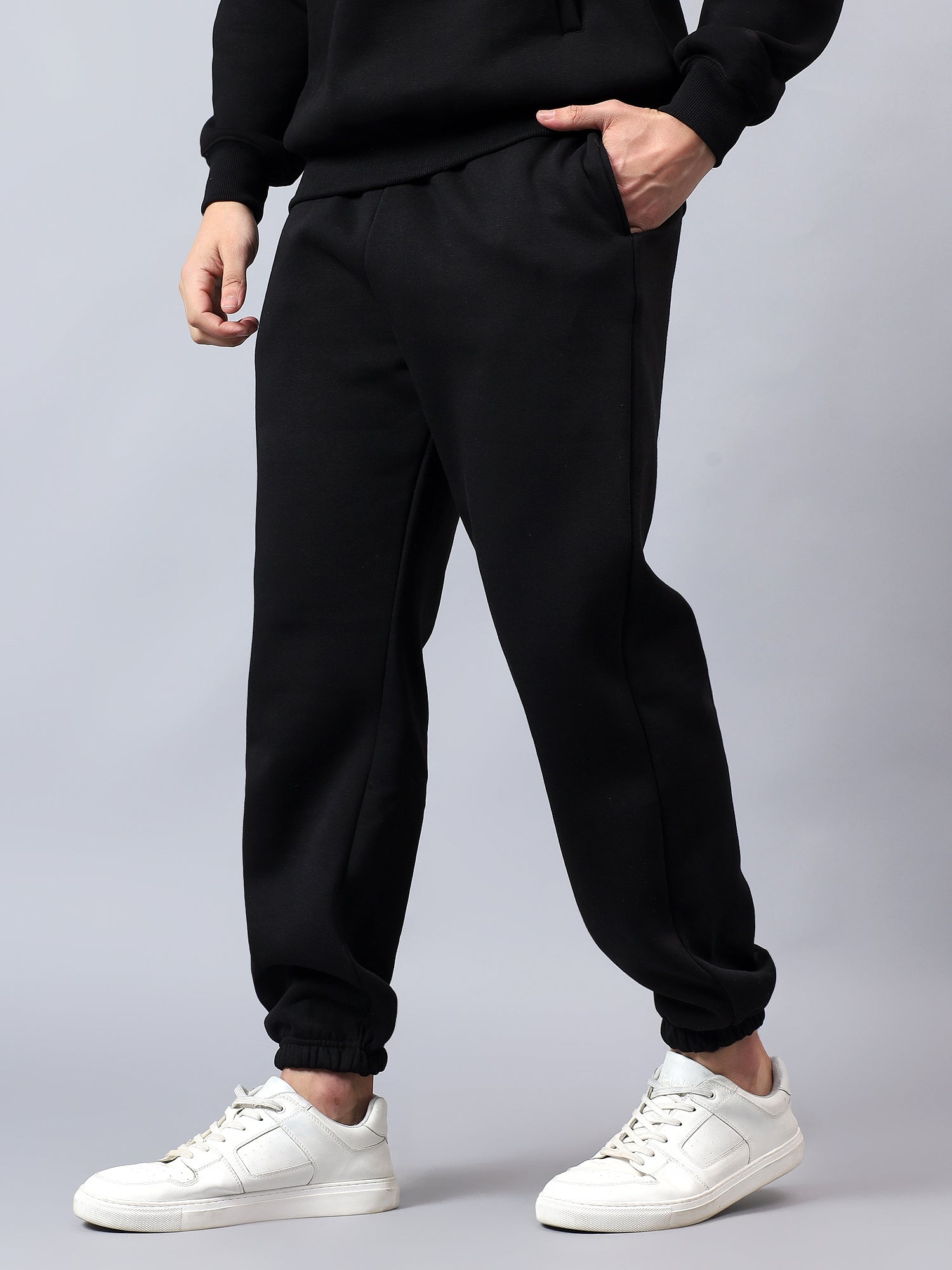 Warm, easy and sharp, these black fleece joggers are built for everyday wear. They come with an elasticated waistband and external drawcord for a secure, adjustable fit, side pockets for your phone and keys, and one clean back pocket for extras. The tapered leg with ribbed cuffs sits neatly over sneakers, making them perfect for travel, lounging or stepping out in a co-ord set with your hoodie.