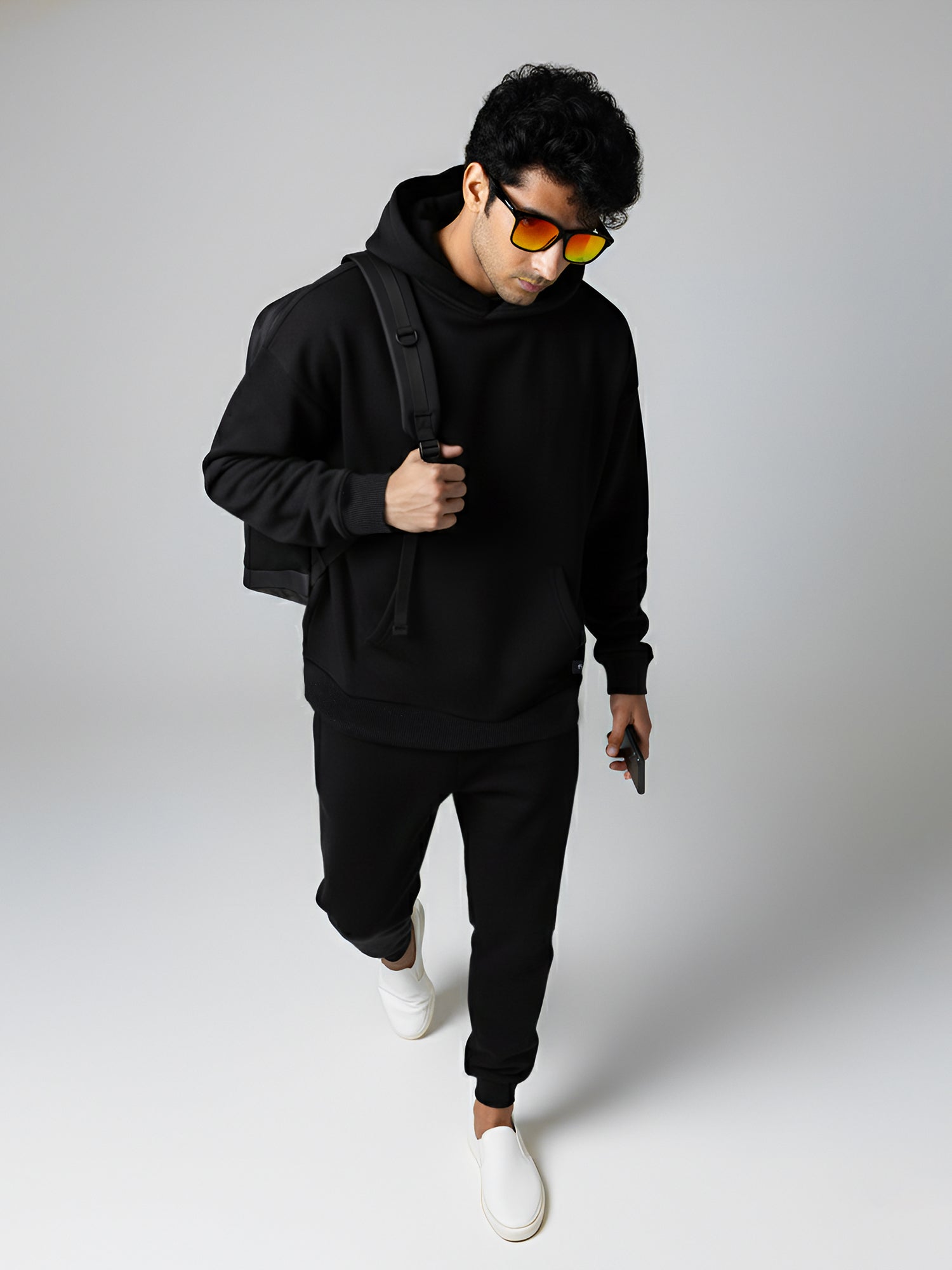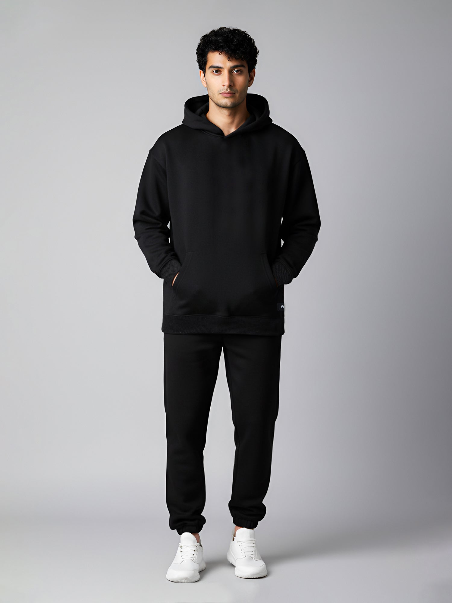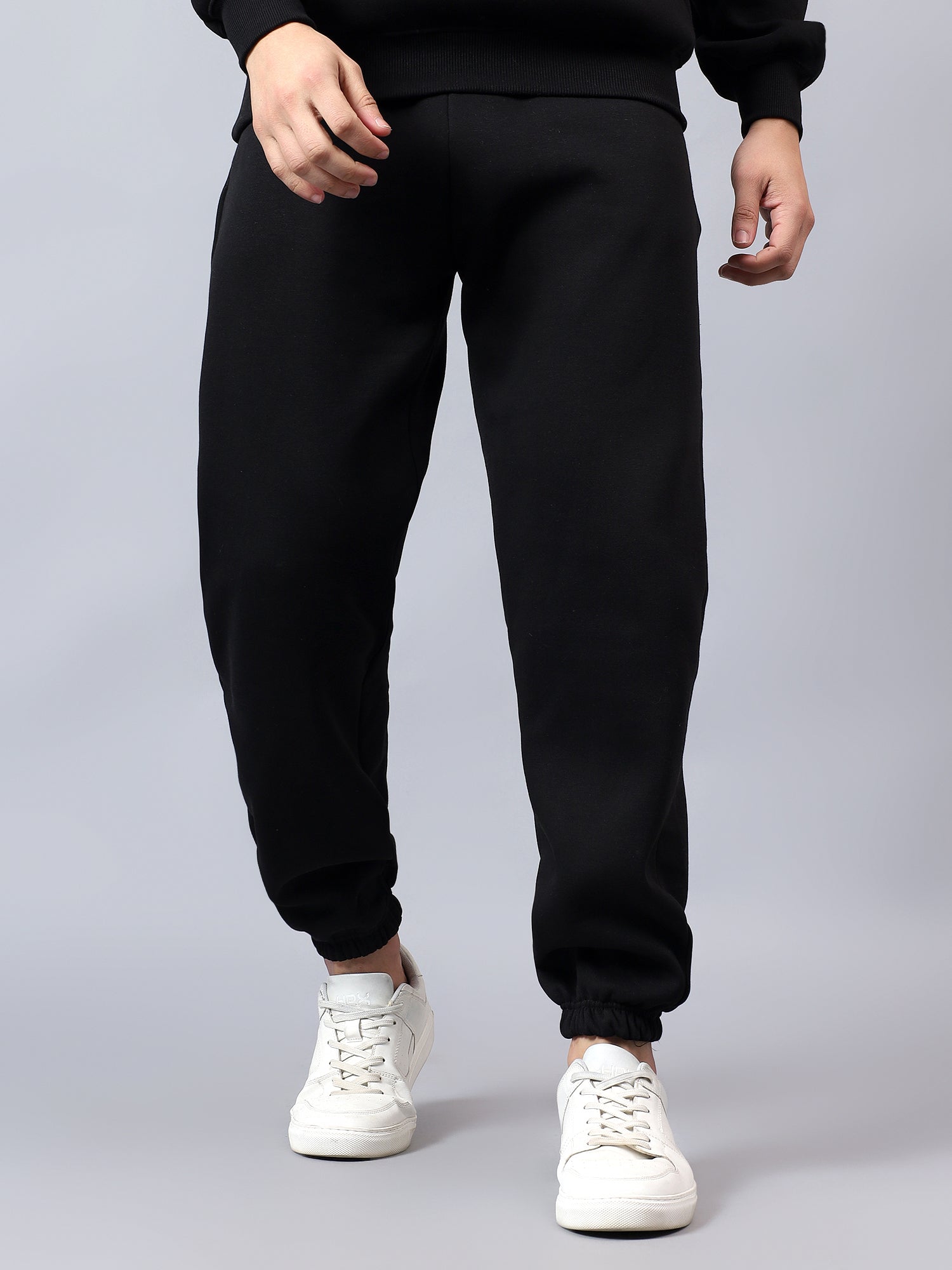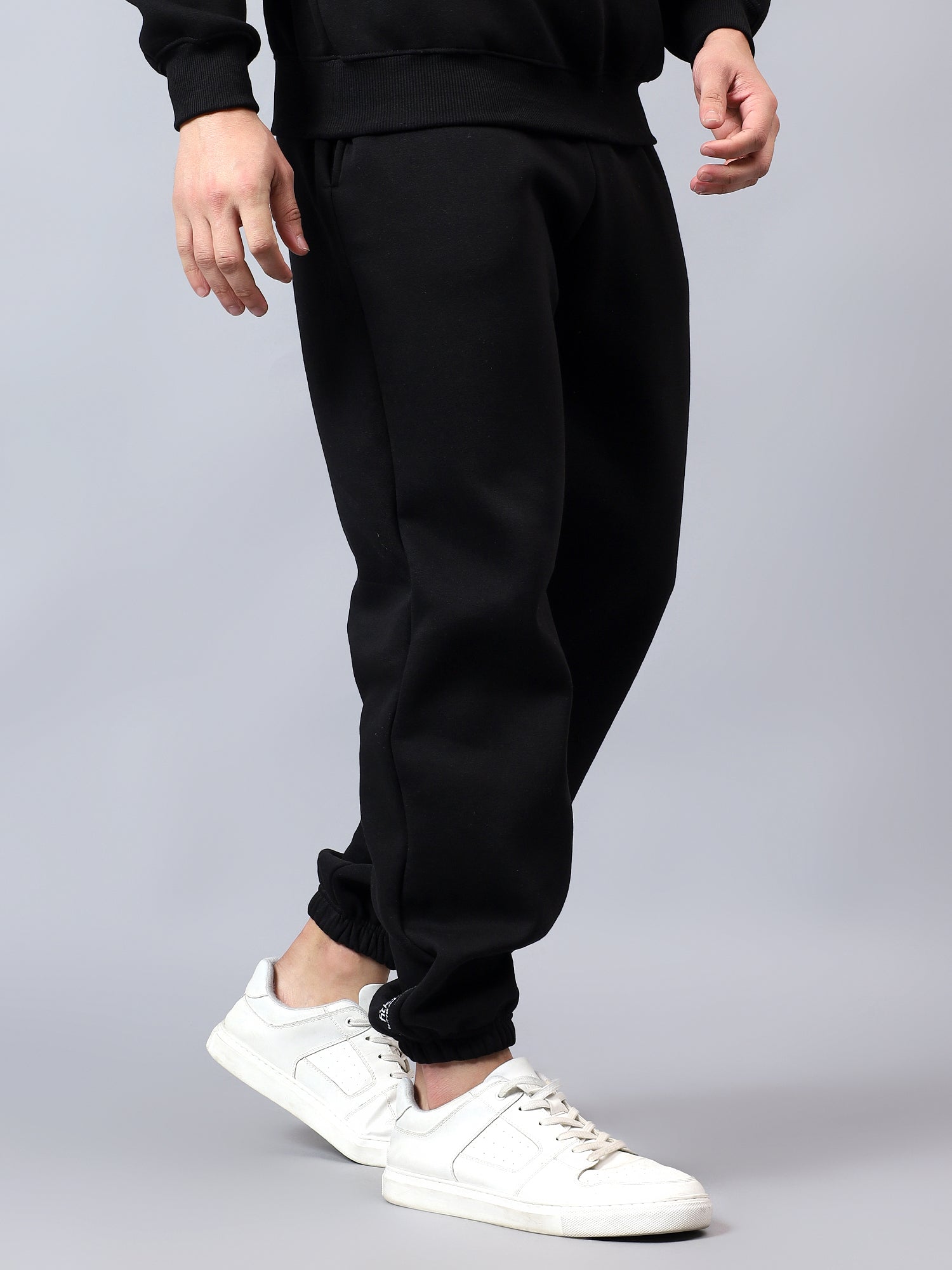 Warm, easy and sharp, these black fleece joggers are built for everyday wear. They come with an elasticated waistband and external drawcord for a secure, adjustable fit, side pockets for your phone and keys, and one clean back pocket for extras. The tapered leg with ribbed cuffs sits neatly over sneakers, making them perfect for travel, lounging or stepping out in a co-ord set with your hoodie.