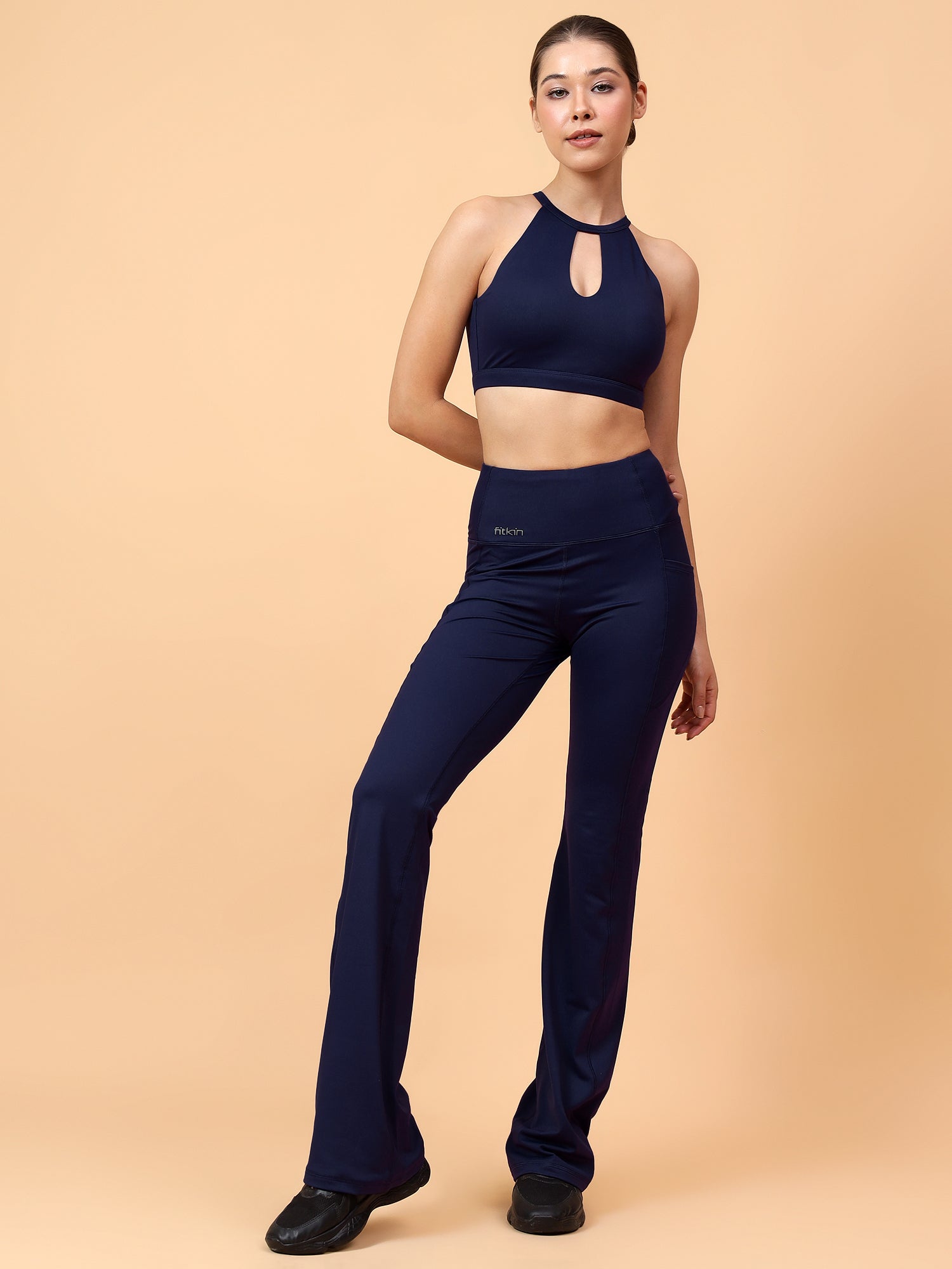 These high-waist bootcut track pants smooth over your waist and hips, then fall into a relaxed flare that skims the legs without clinging. The soft, stretchy fabric moves with you, while the longer length sits neatly over sneakers for a taller, streamlined look. Perfect for walks, travel days, or light workouts when you want all-day comfort with a polished, flattering fit.