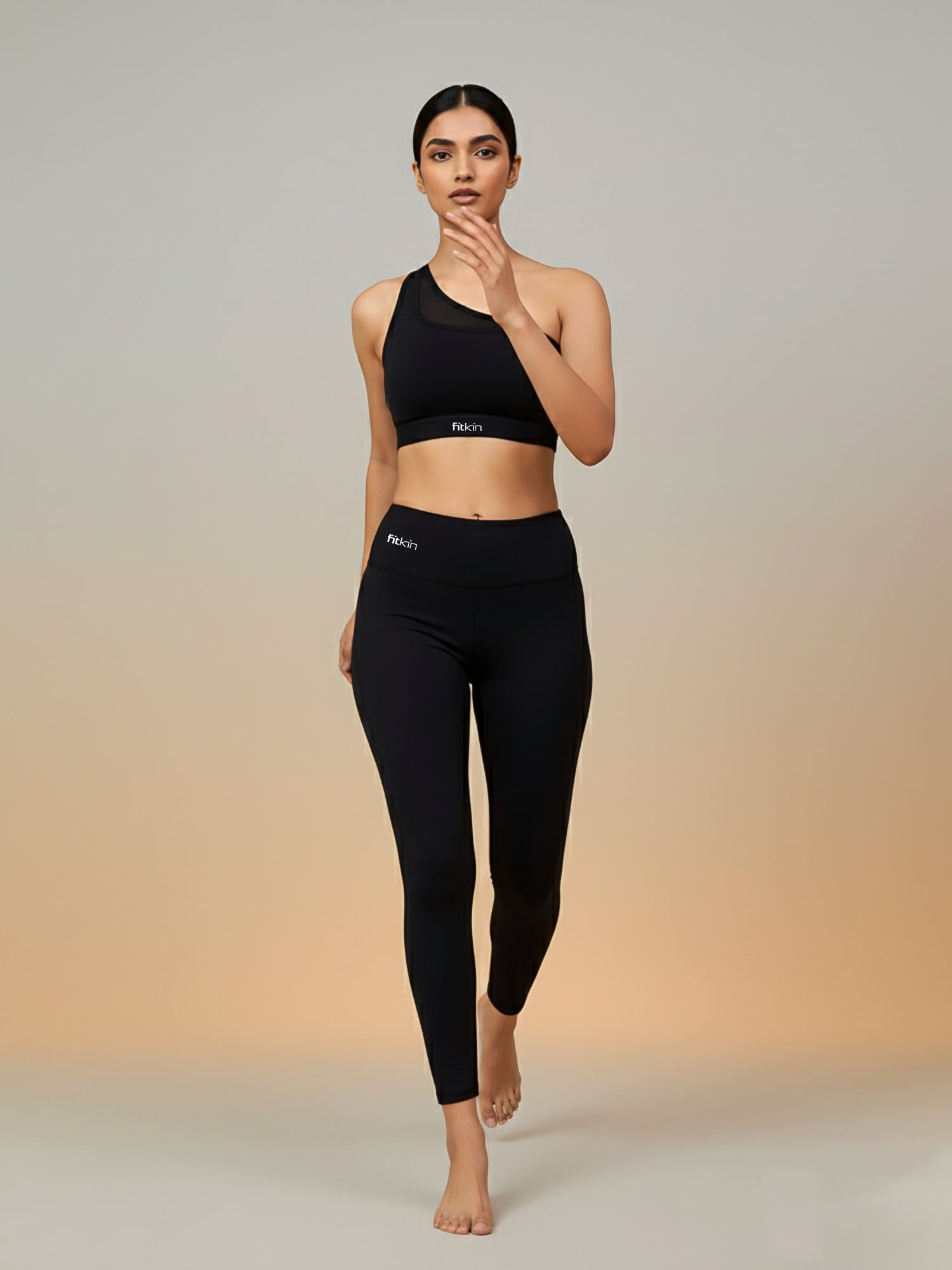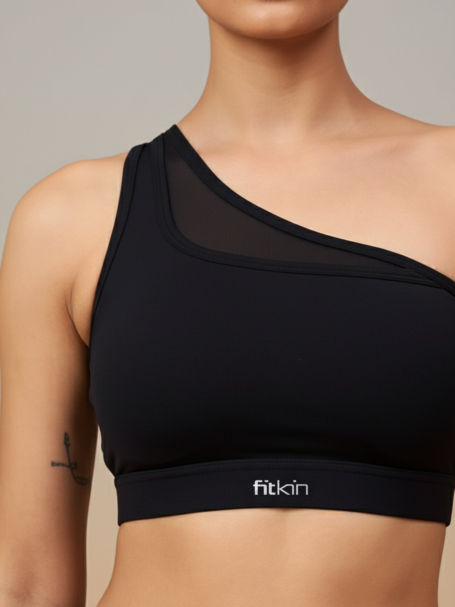 This black one-shoulder sports bra redefines modern activewear with its bold, sculpted silhouette. Featuring a front mesh panel for ventilation and a striking multi-strap back design, it blends functionality with statement appeal. The sleek, supportive fit flatters your shape while ensuring freedom of movement—perfect for yoga, training, or lounging in style.