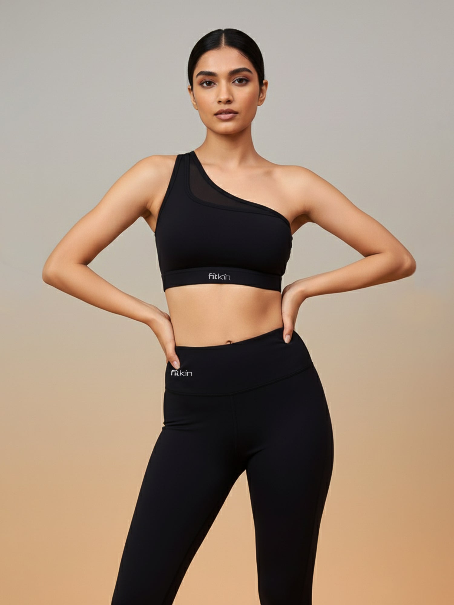 Women Black One Shoulder Sports Bra for Gym & Workout