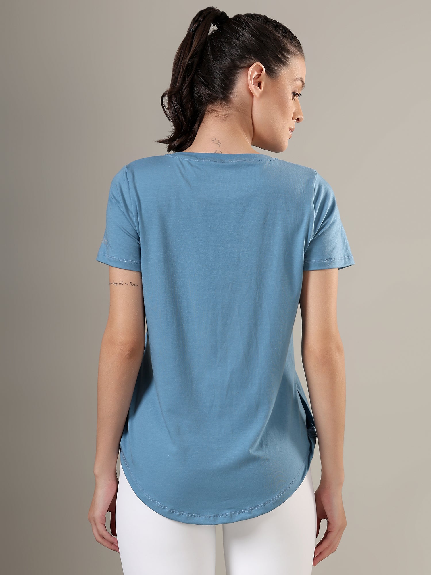 Where ease meets edge. Made from eco-friendly Lyocell fabric, this relaxed-fit blue t-shirt features a rounded high-low hem that offers extra coverage and a flattering silhouette—perfect for movement or downtime. Soft, breathable, and built for comfort, it’s your everyday essential for wherever the day takes you.