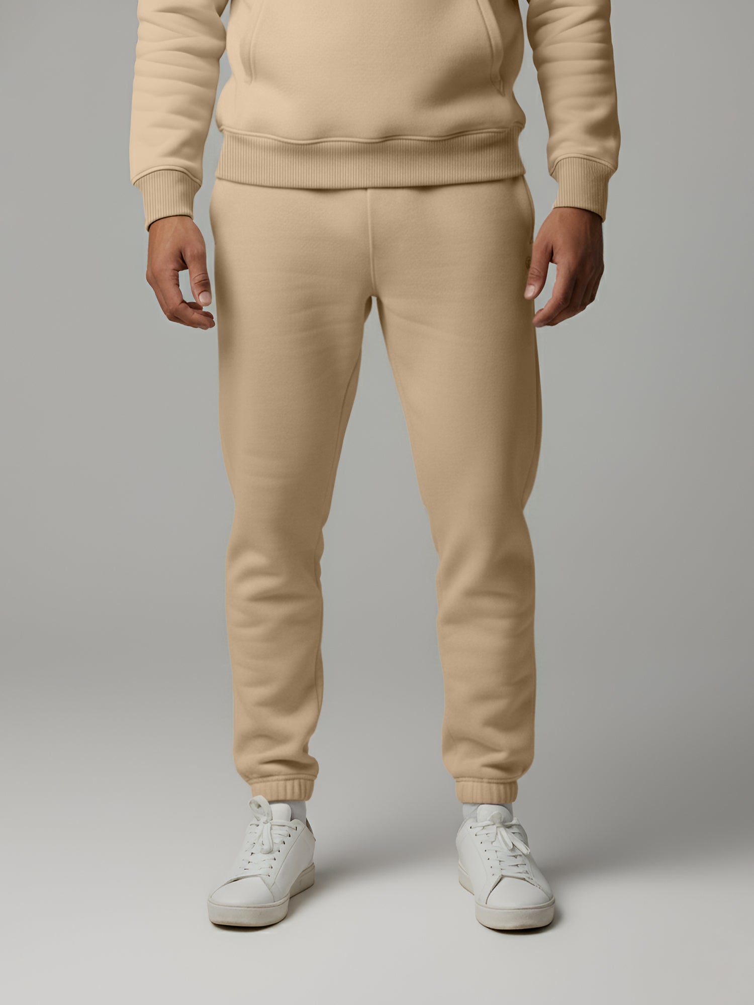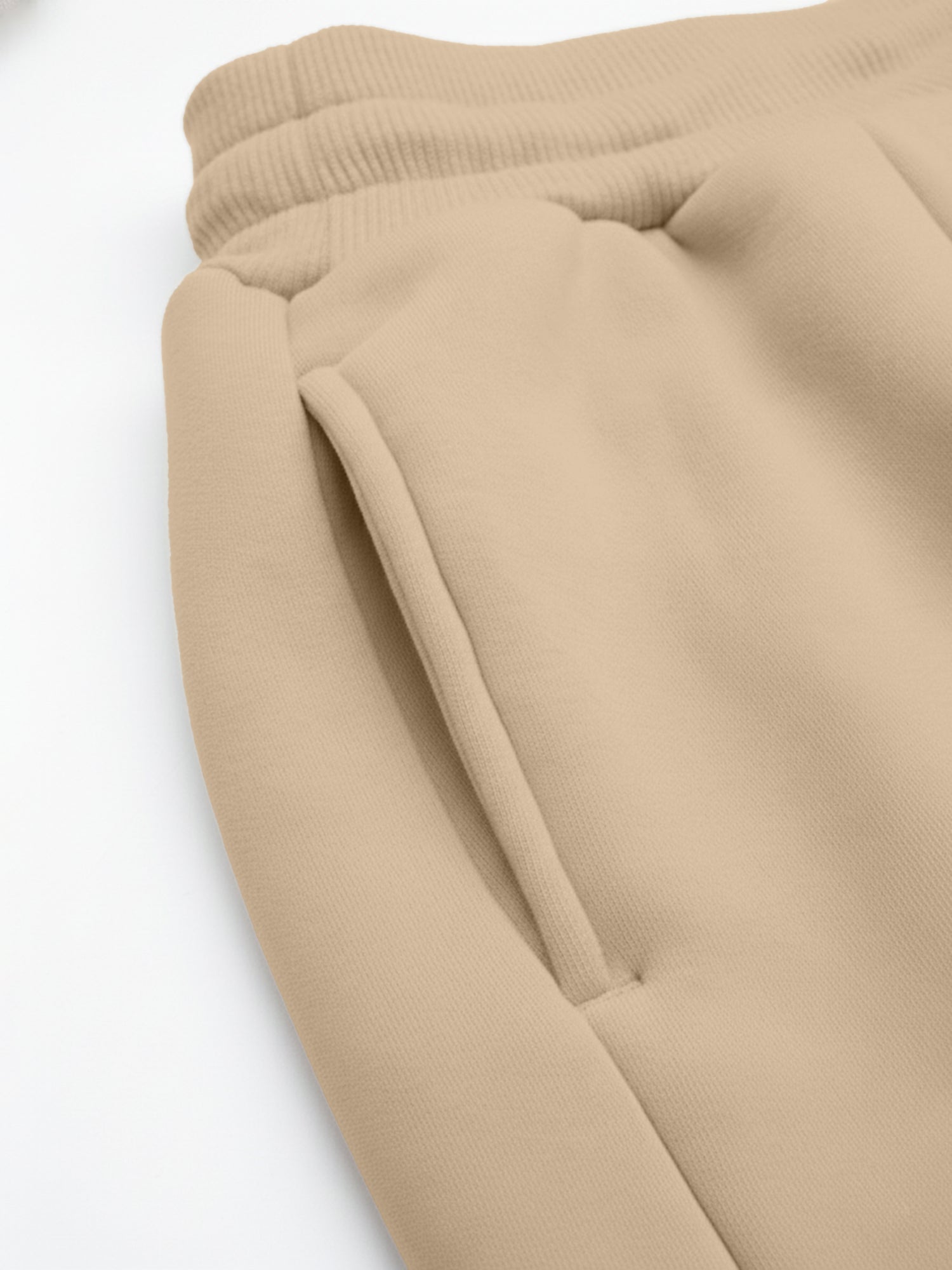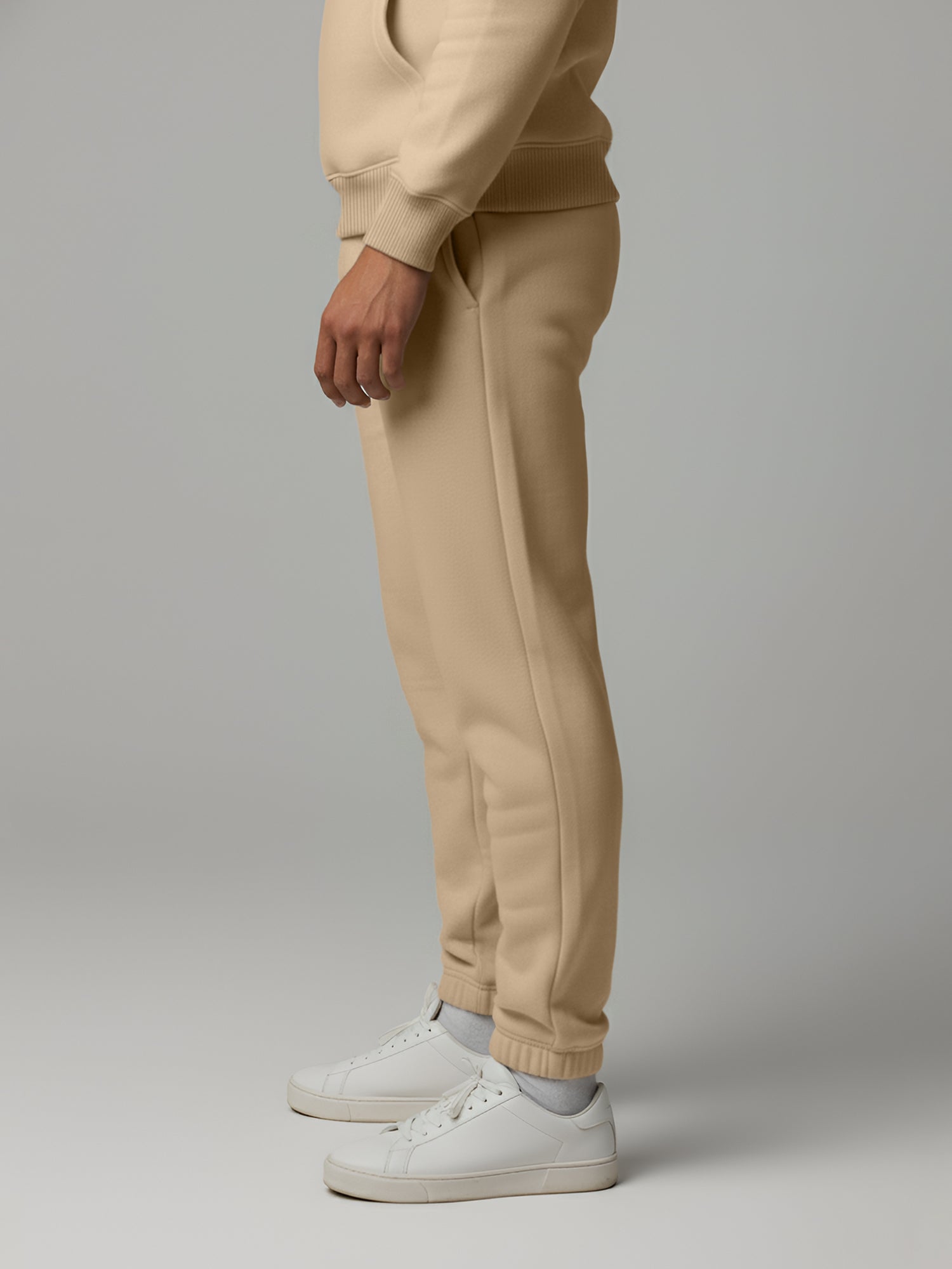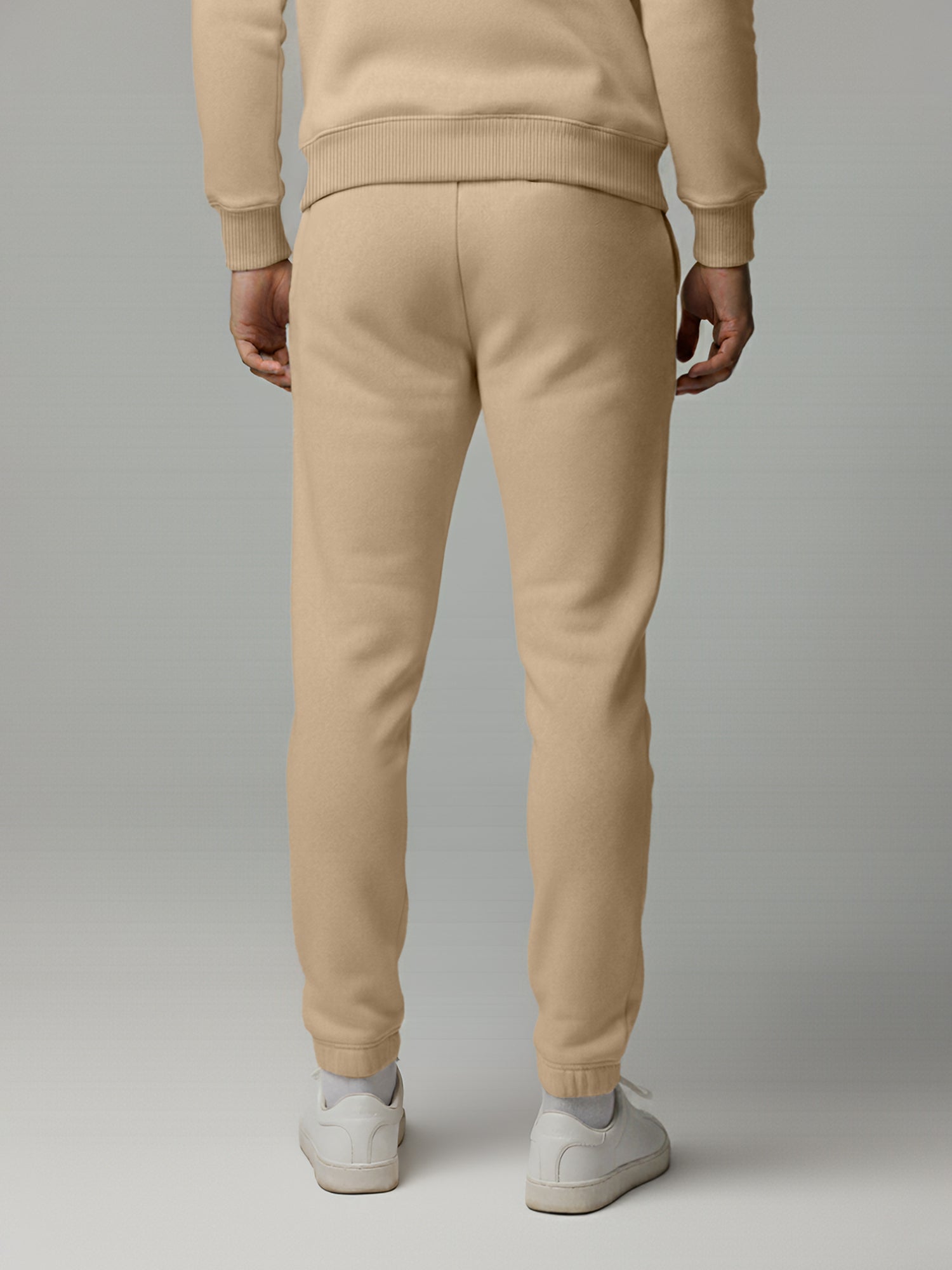 Warm, easy and sharp, these beige fleece joggers are built for everyday wear. They come with an elasticated waistband and external drawcord for a secure, adjustable fit, side pockets for your phone and keys, and one clean back pocket for extras. The tapered leg with ribbed cuffs sits neatly over sneakers, making them perfect for travel, lounging or stepping out in a co-ord set with your hoodie.