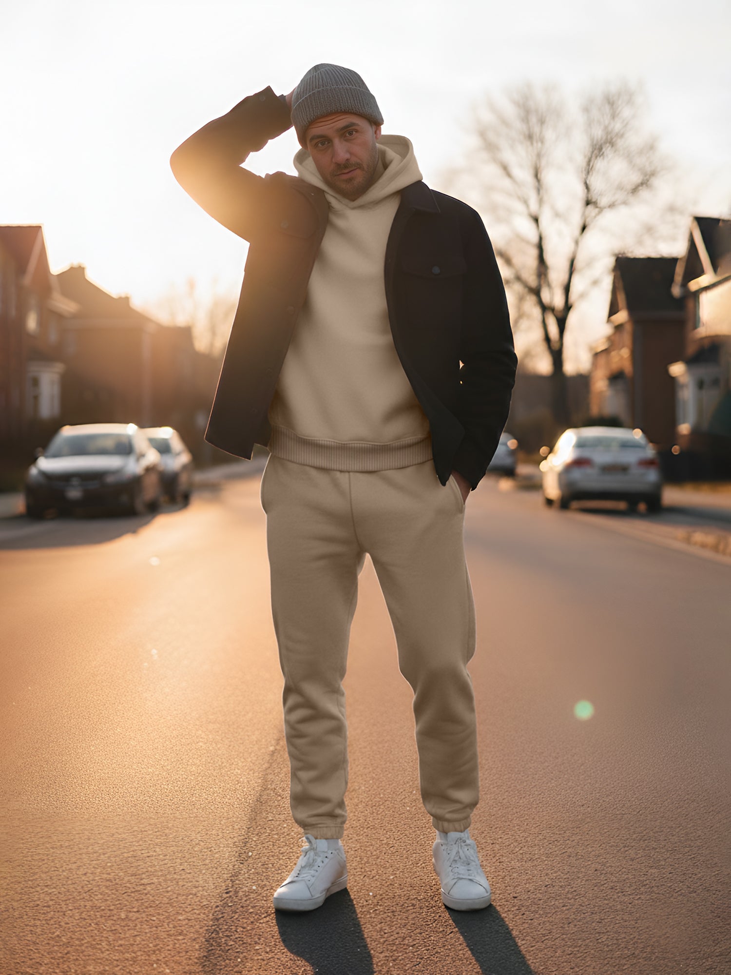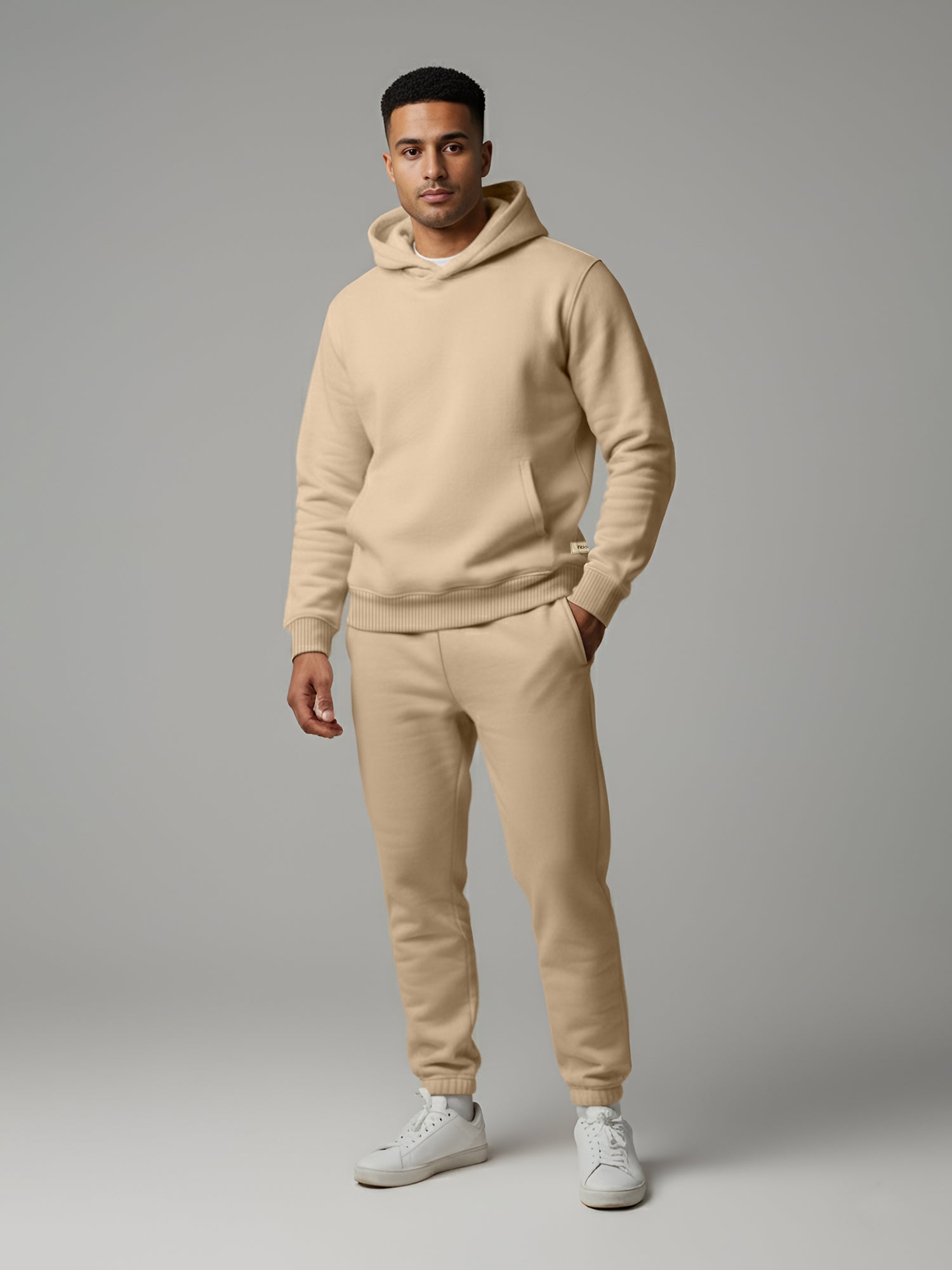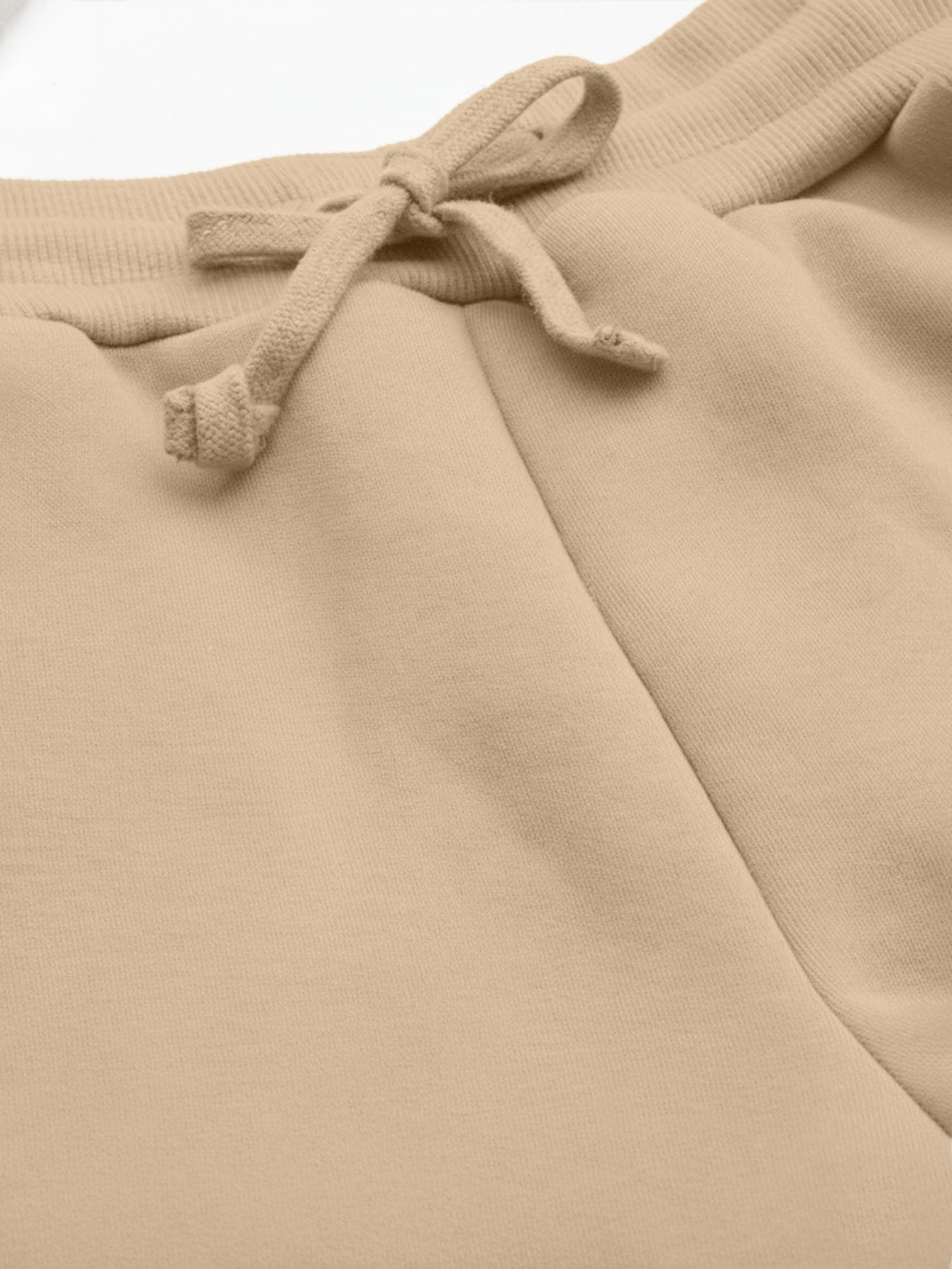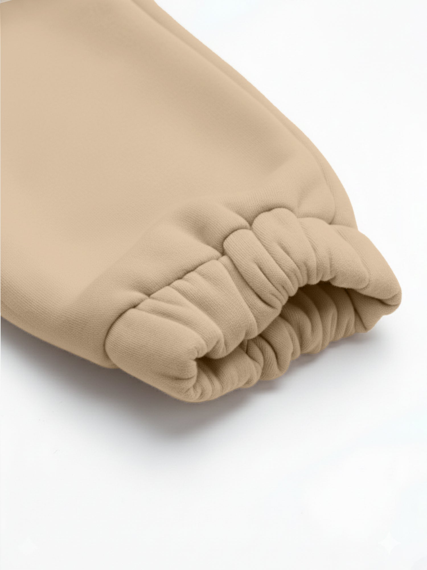 Warm, easy and sharp, these beige fleece joggers are built for everyday wear. They come with an elasticated waistband and external drawcord for a secure, adjustable fit, side pockets for your phone and keys, and one clean back pocket for extras. The tapered leg with ribbed cuffs sits neatly over sneakers, making them perfect for travel, lounging or stepping out in a co-ord set with your hoodie.