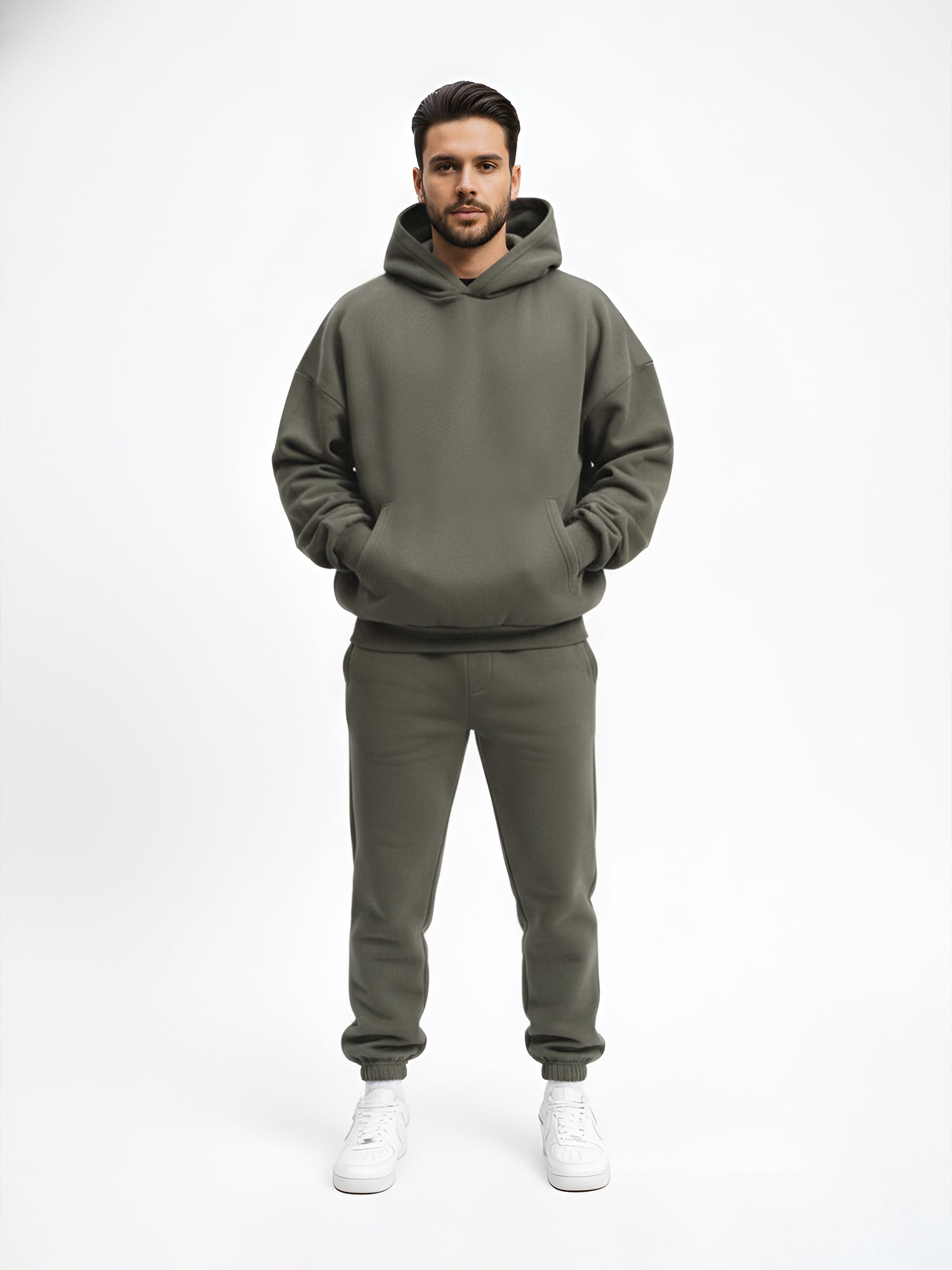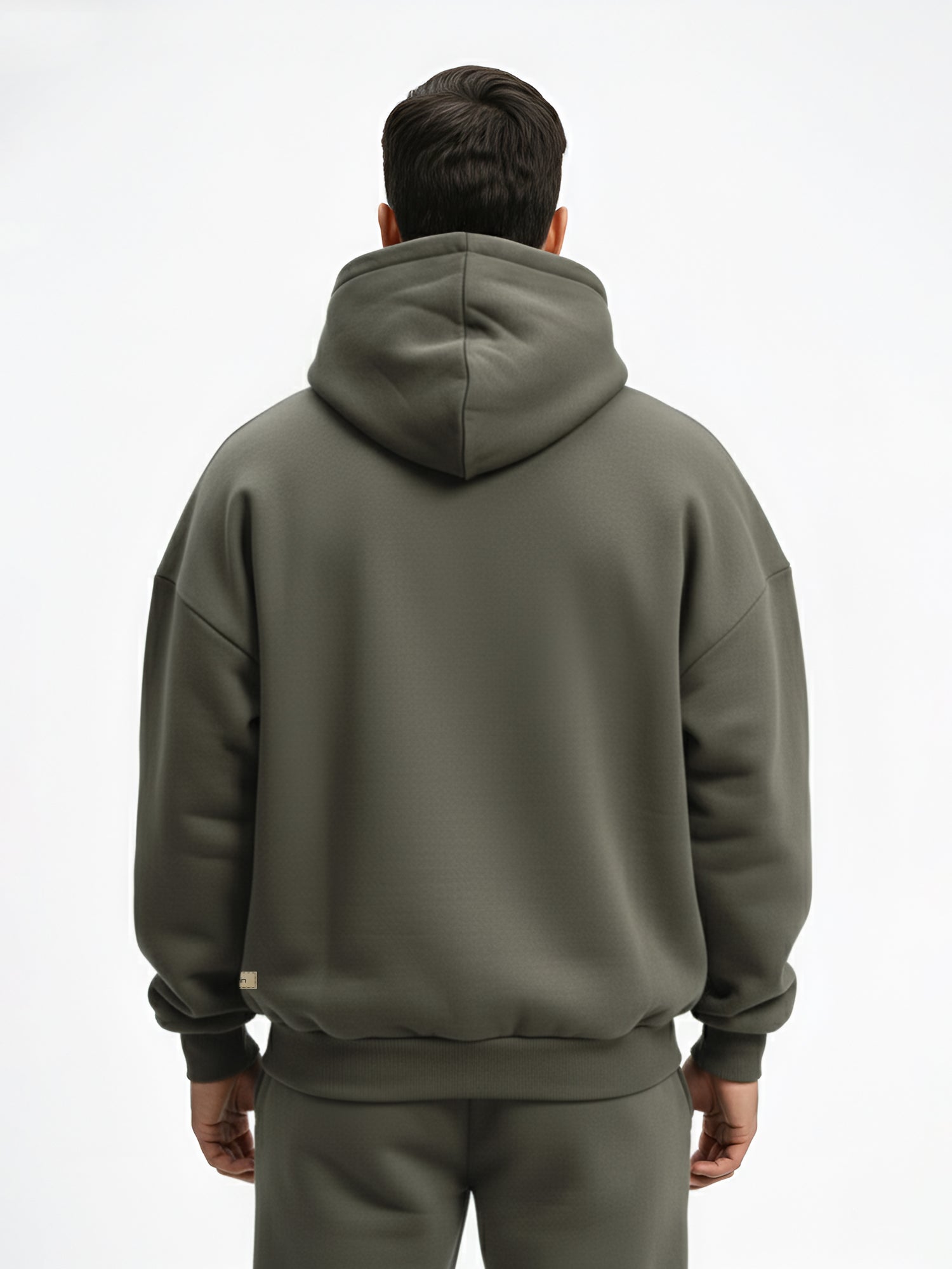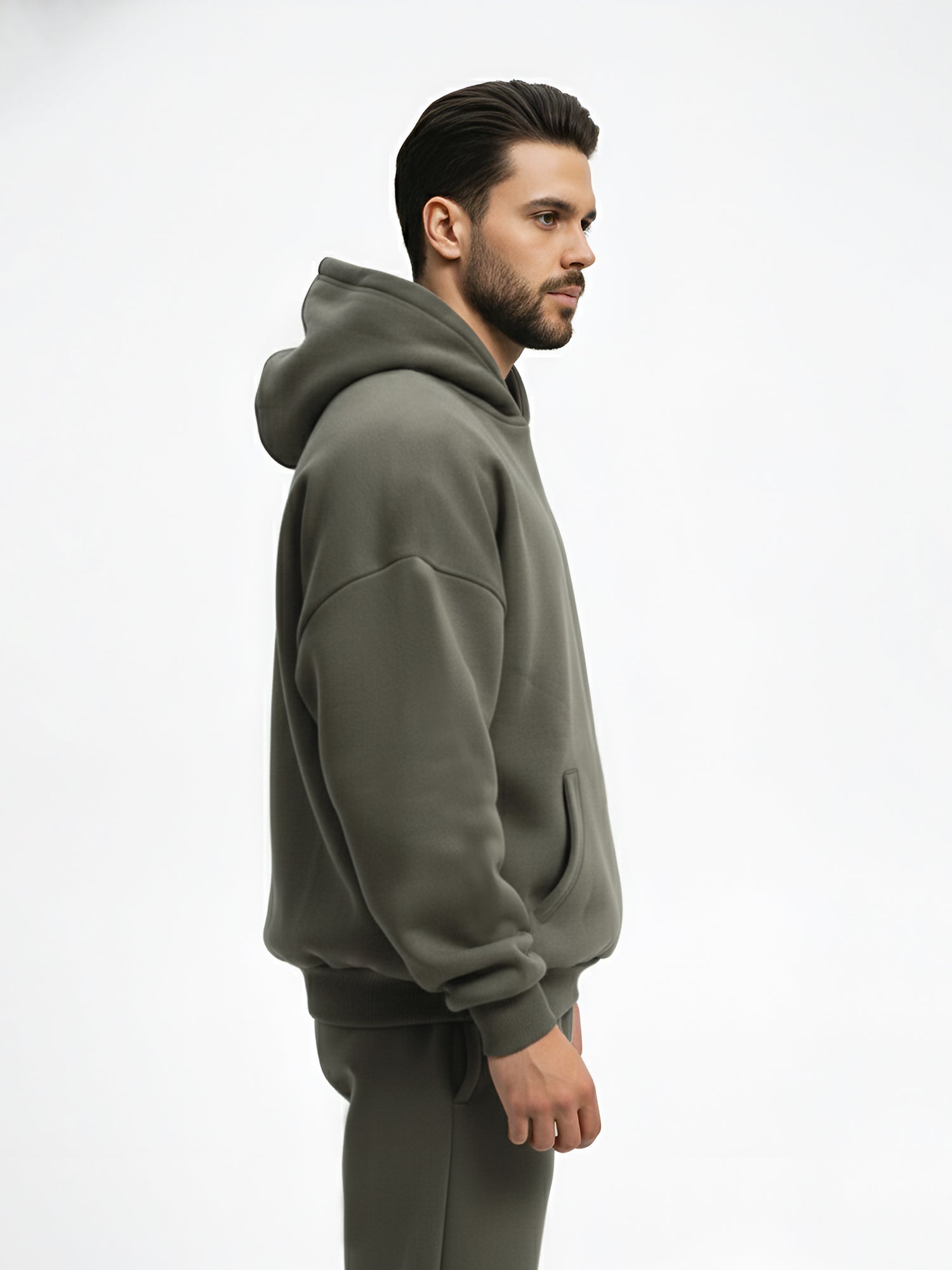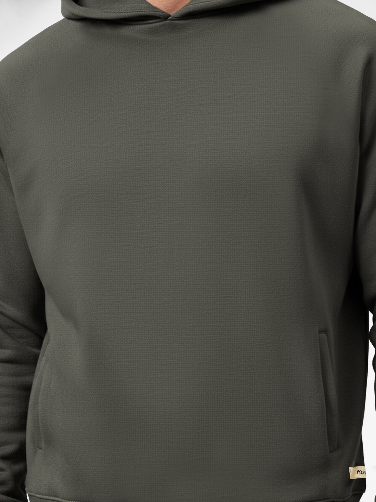 A cosy olive men’s hoodie in soft fleece with a relaxed, drop-shoulder fit. Features a spacious front side pocket for warmth and storage, ribbed cuffs and bottom hem to hold shape, and a clean hood for a minimal, modern look. Designed for everyday wear – from airport layers to easy street style.