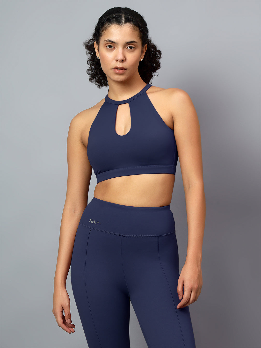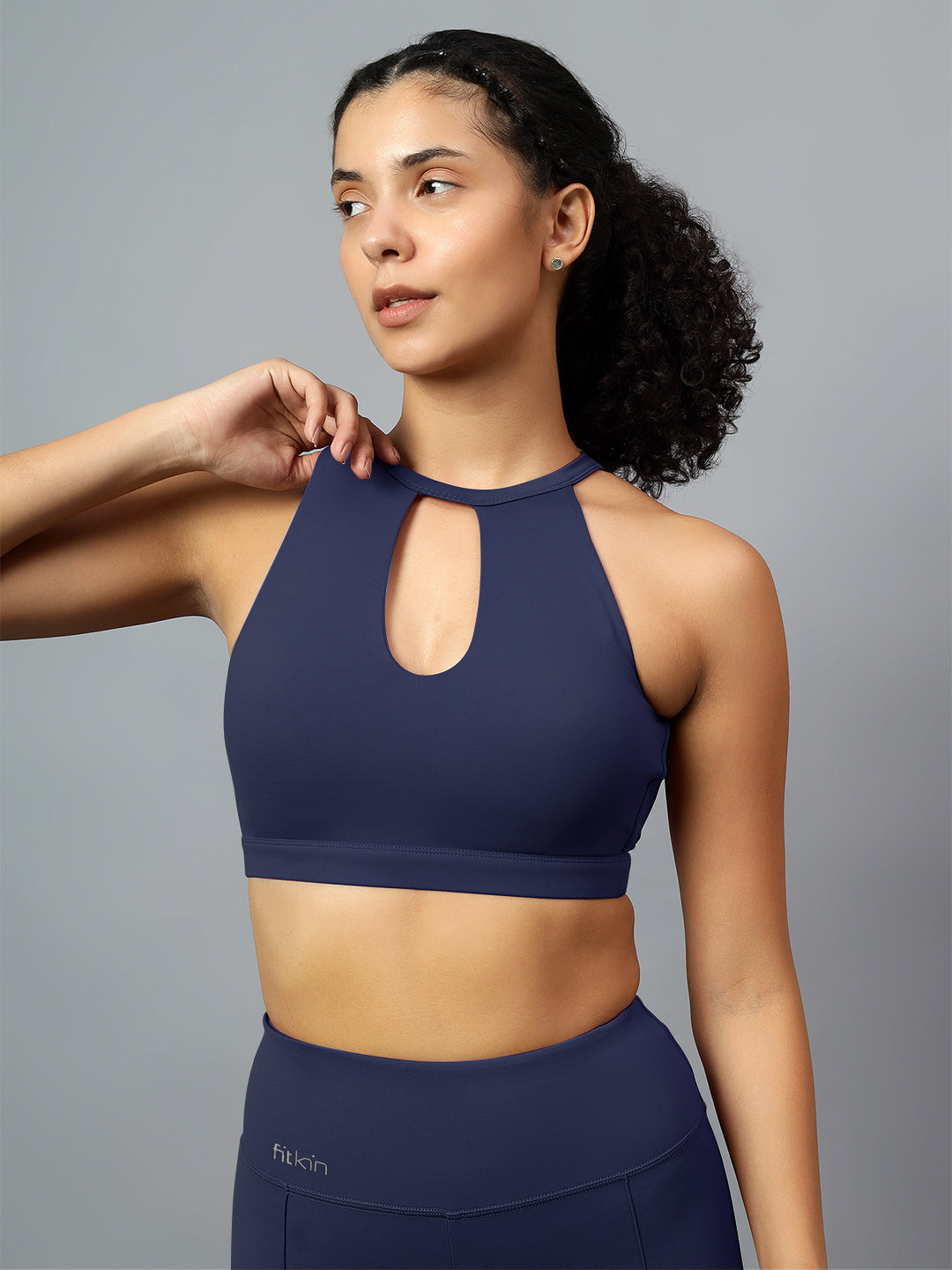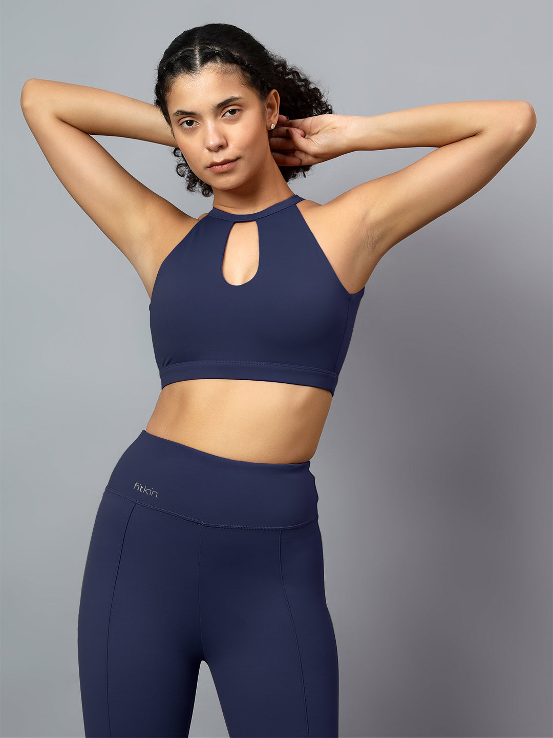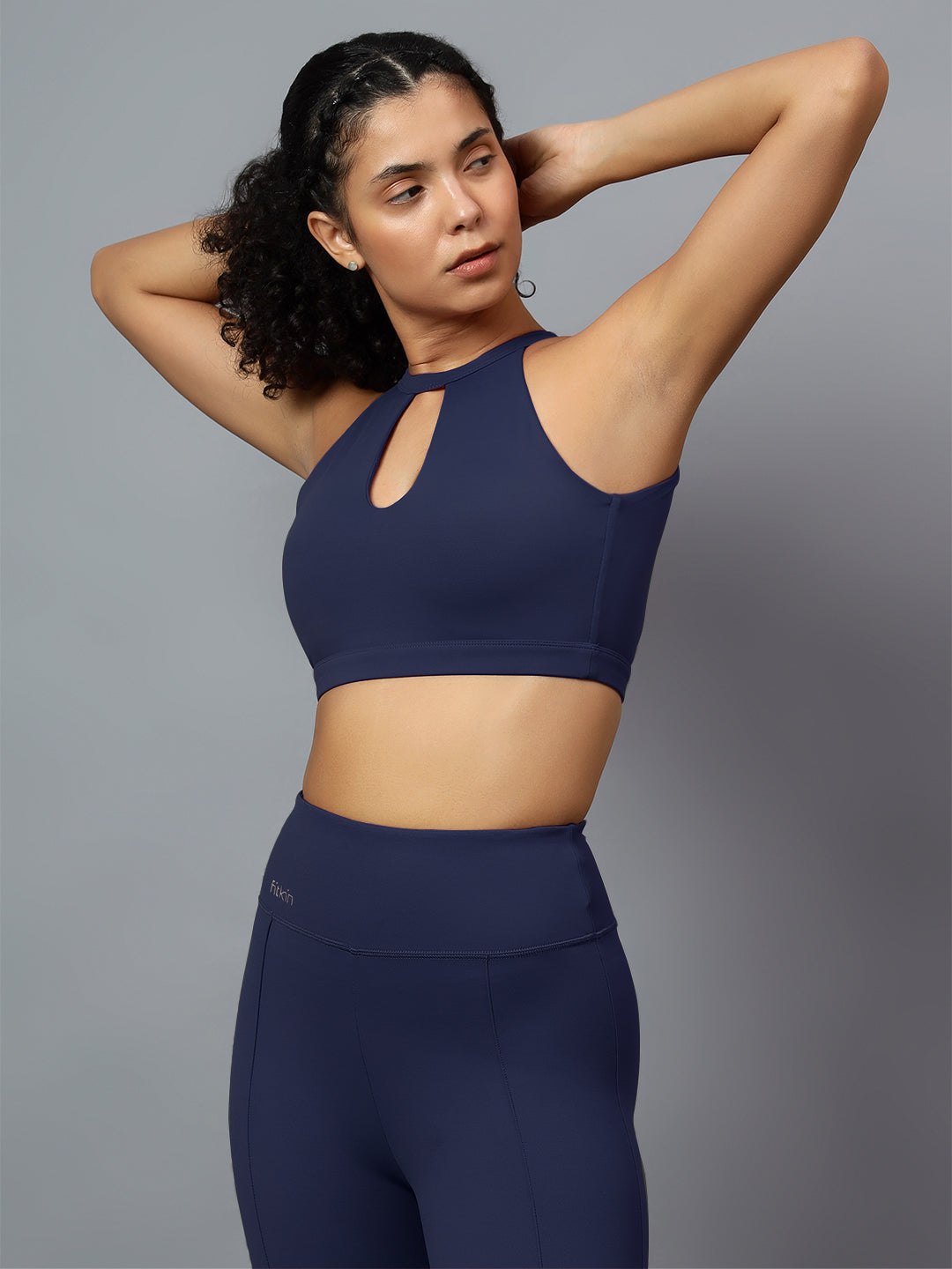 This navy blue high-neck sports bra combines sophistication with athletic functionality. Featuring a front keyhole detail and an open-back racer design, it delivers the perfect mix of support and style. The wide underband ensures a stay-put fit, while the sleek, stretchable fabric flatters every move. Perfect for studio sessions, dance, or athleisure looks that stand out.