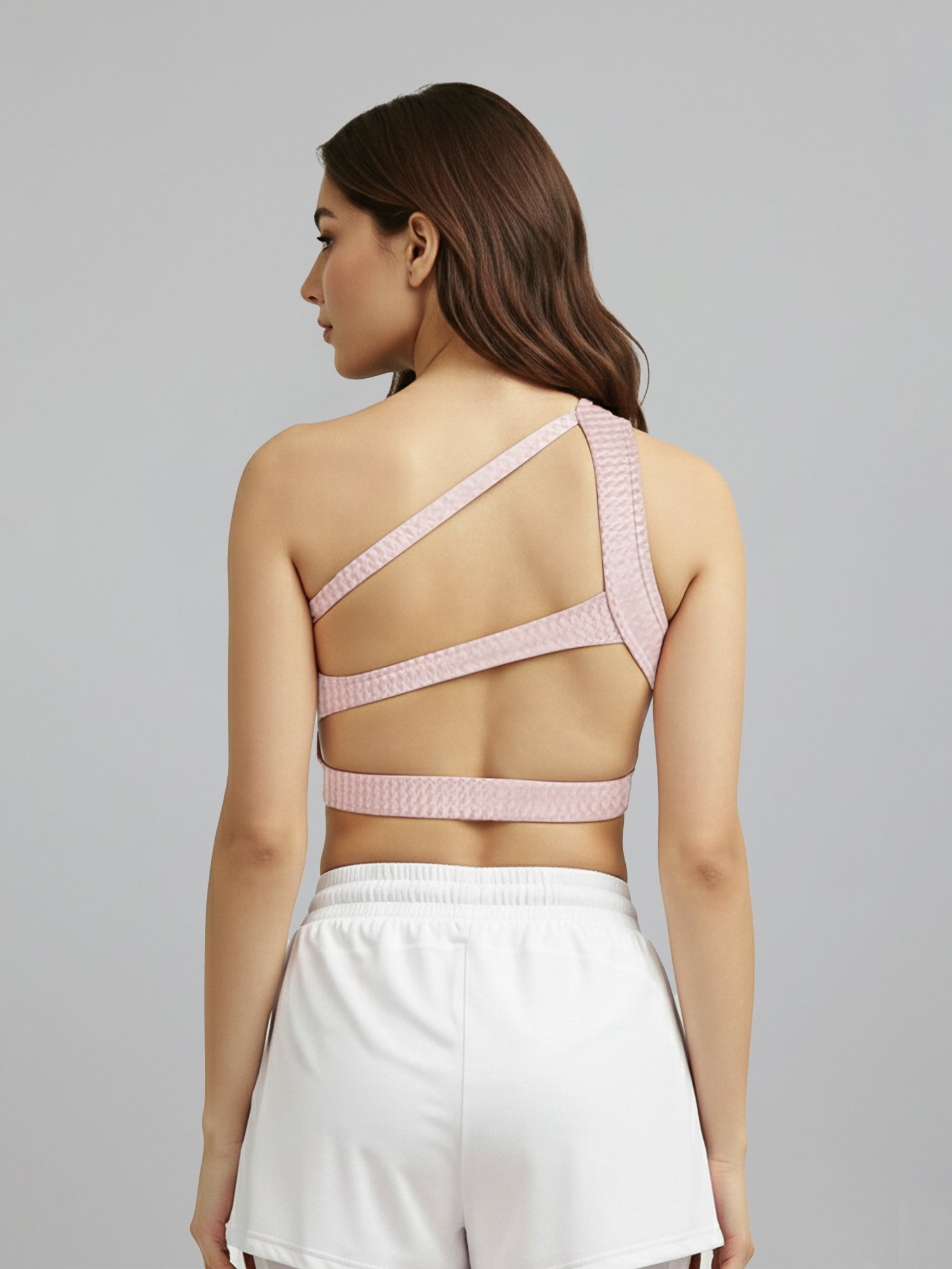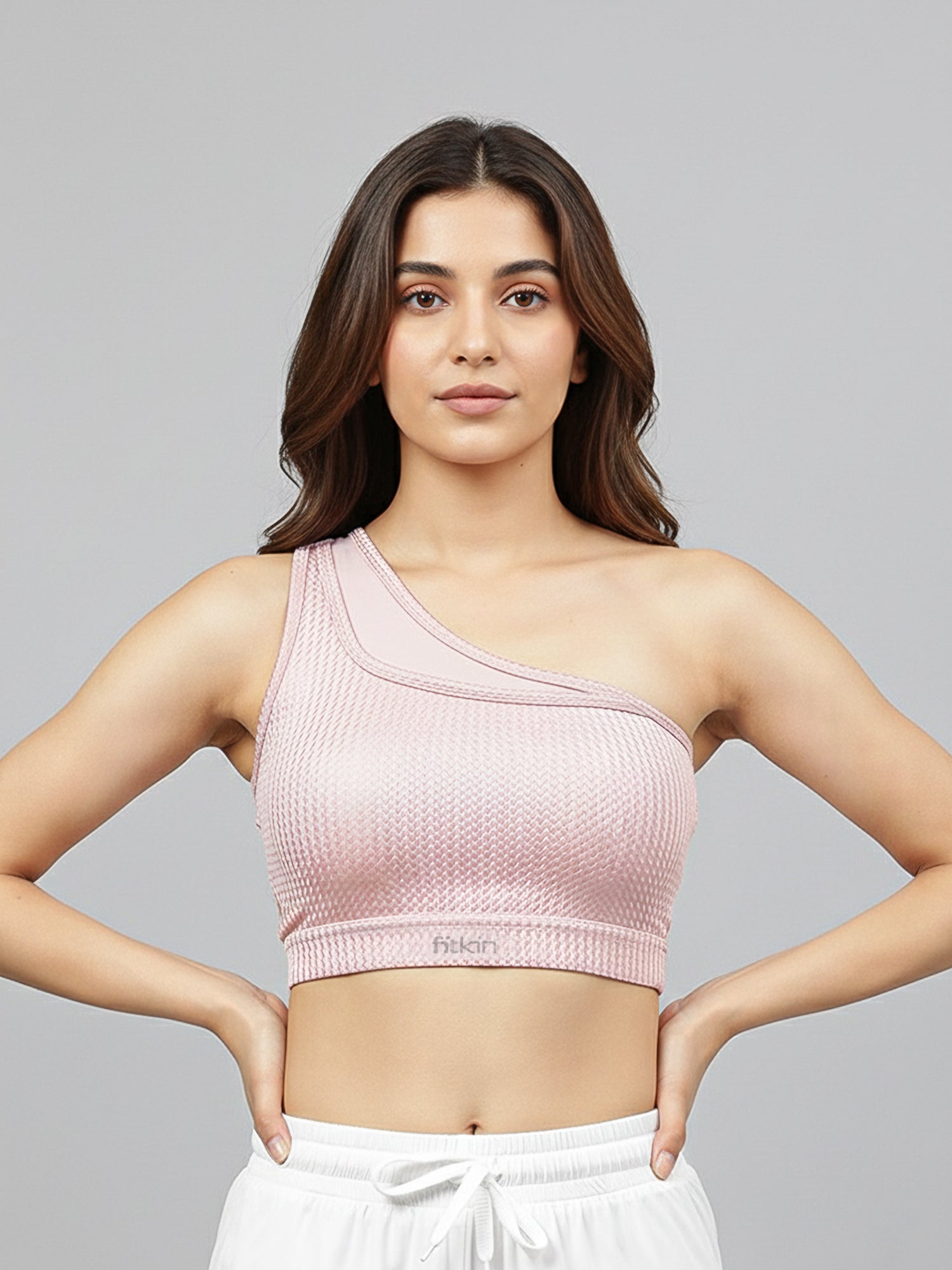 Bring elegance to your activewear with the Fitkin Blush Pink One-Shoulder Sports Bra — where soft sophistication meets powerful performance. Designed with a textured finish and a modern asymmetrical neckline, this piece delivers effortless style and all-day comfort.