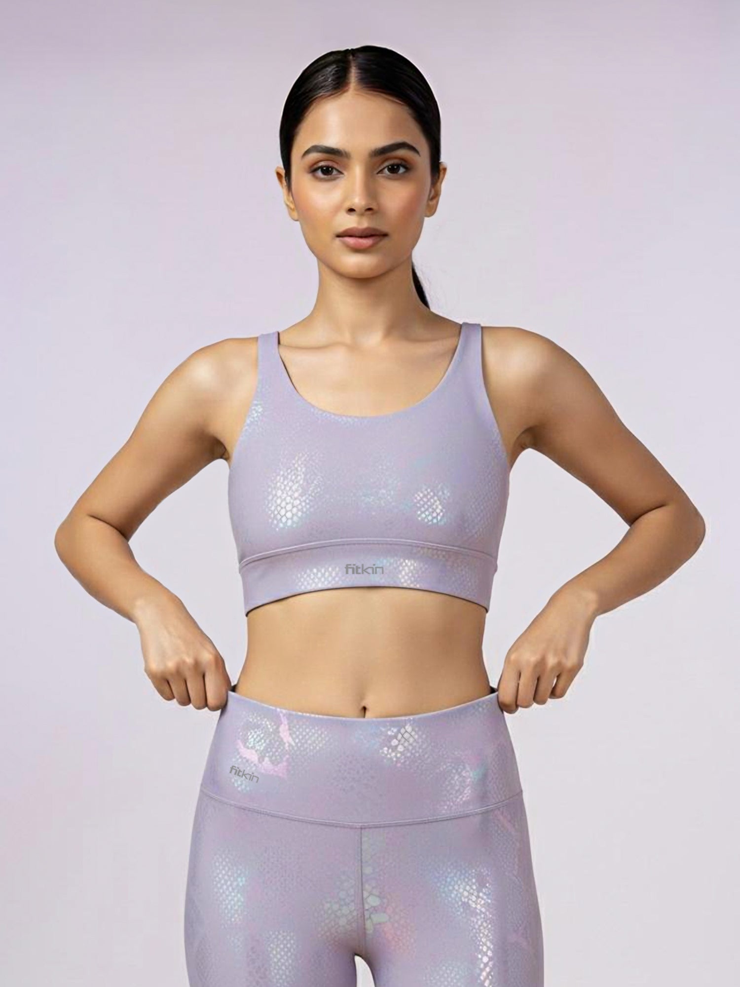 "Fierce meets feminine – shine through your workouts in this glossy lavender snake print sports bra, designed to be both flattering and supportive for medium-impact activities.