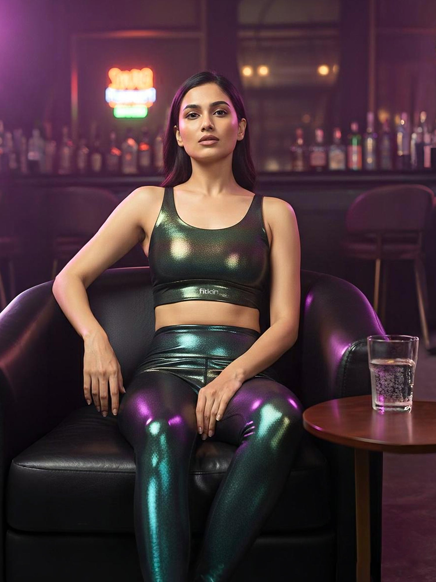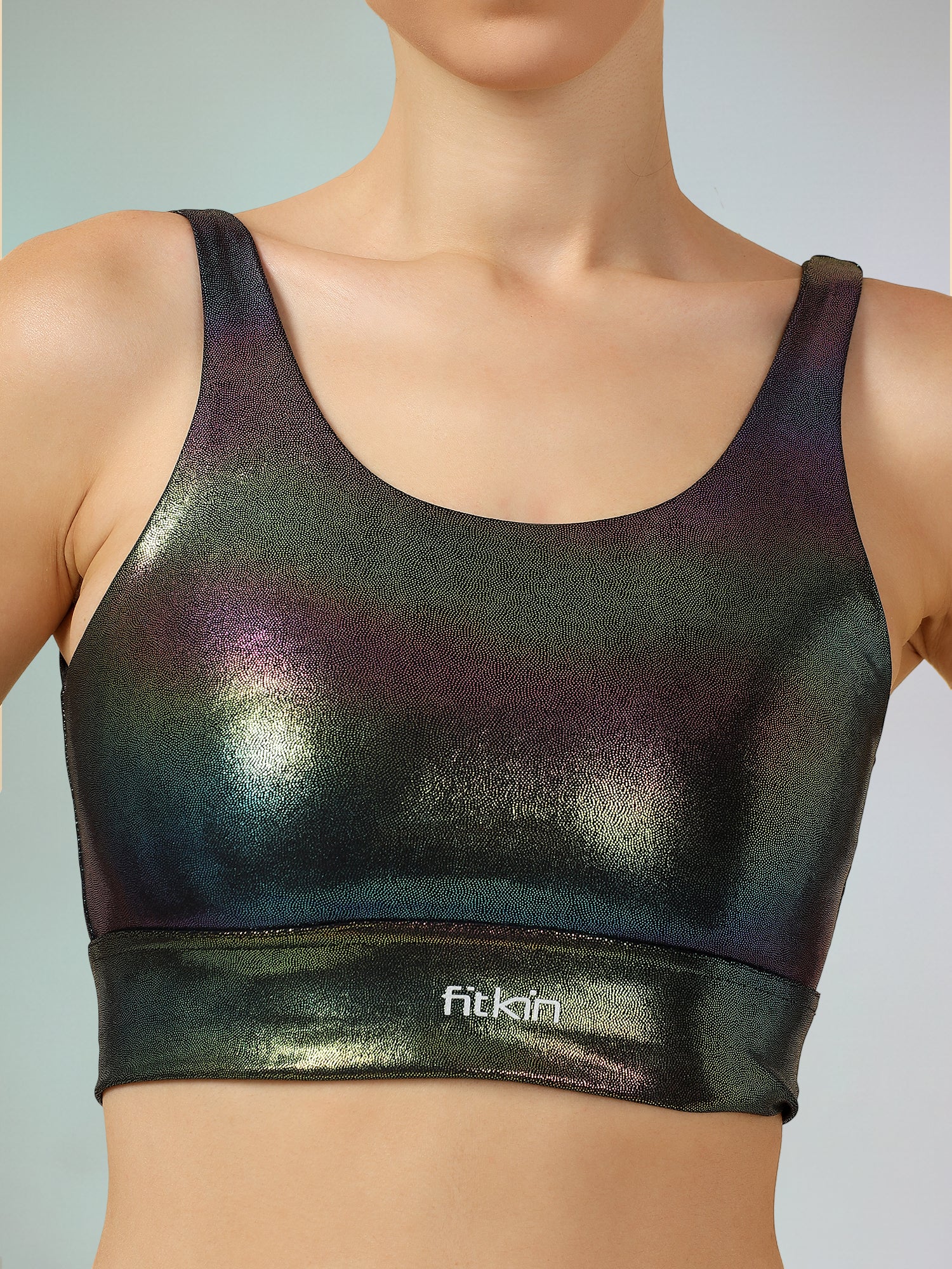 Glow in Motion This iridescent sports bra brings bold energy and next-level shine to every move. With a body-hugging fit and medium support, it’s perfect for both performance and style.