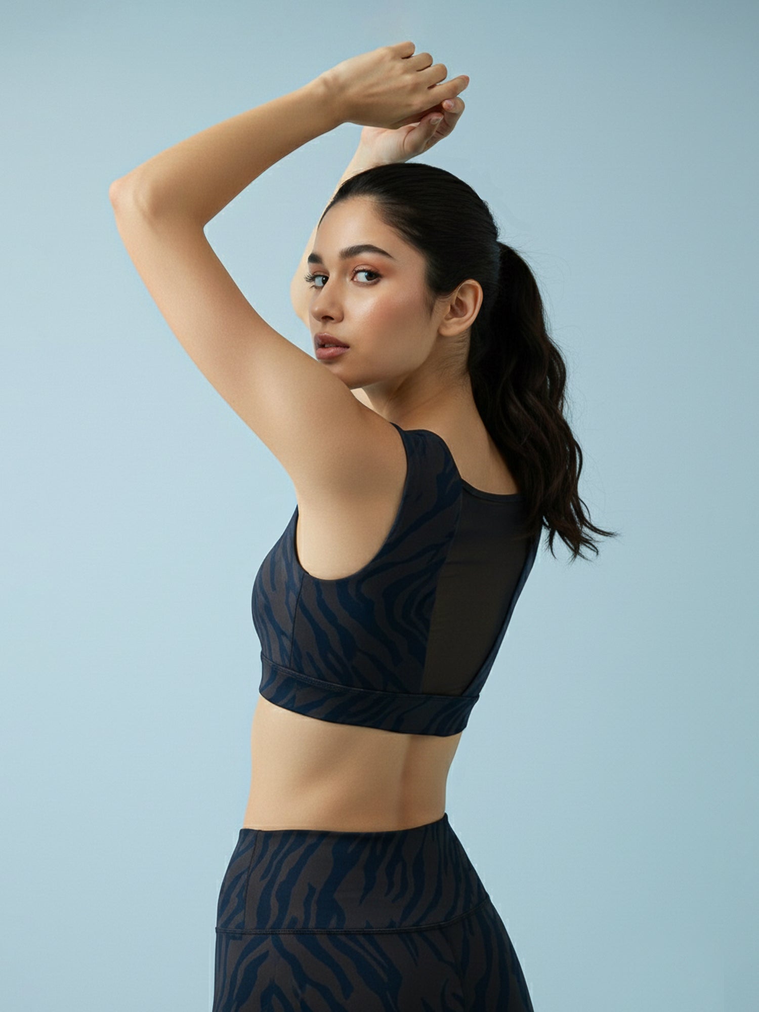 This blue–Grey zebra-print sports bra blends attention-grabbing design with functional support. The mesh detail and cut-and-sew structure elevate its visual appeal, while the wide band and high-performance fabric make it perfect for workouts or athleisure styling. It’s a statement piece that doesn't compromise on support or comfort.