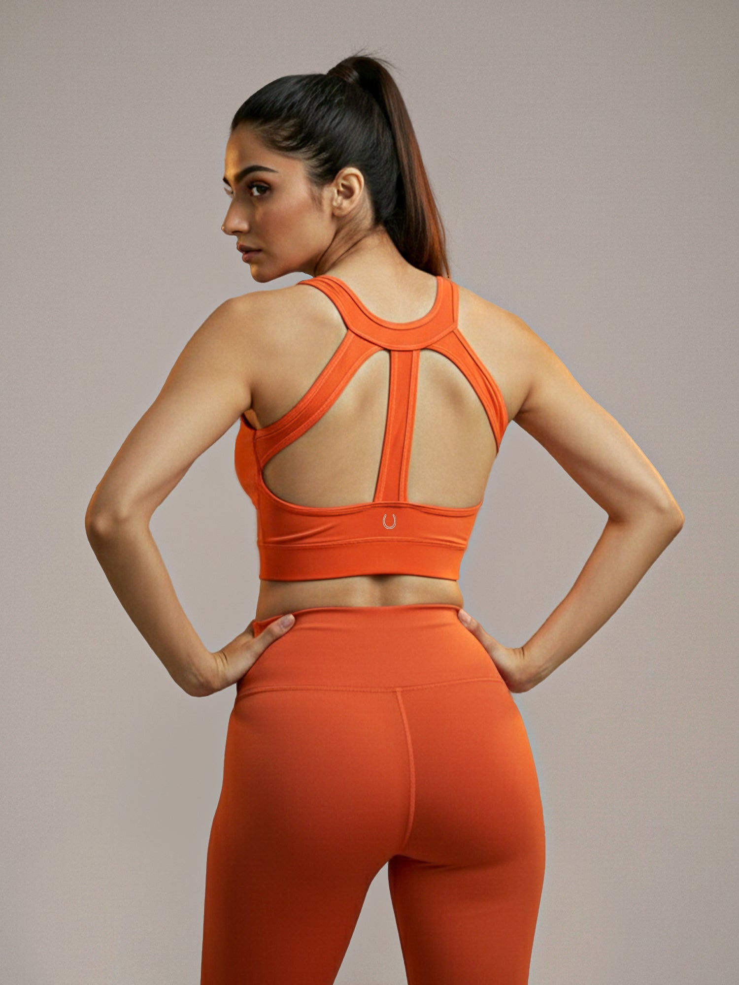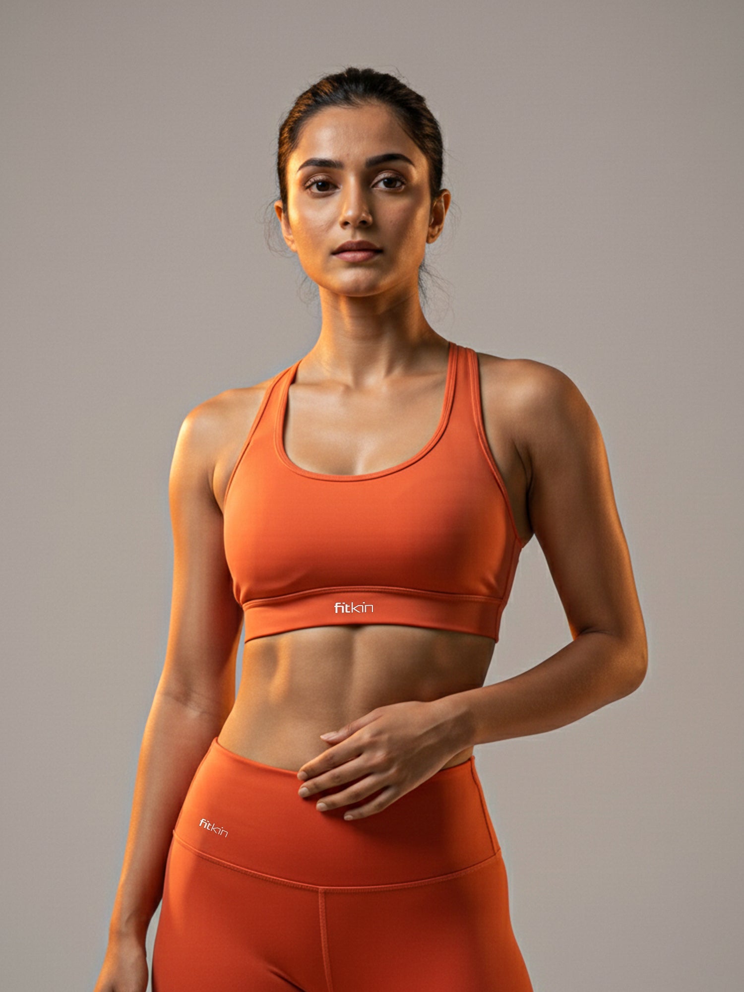 Move with power, breathe with ease. This rust-toned Fitkin sports bra is designed to deliver both support and statement style. The bold multi-strap back design gives it a sculpted, modern edge while ensuring maximum ventilation during high-intensity workouts.