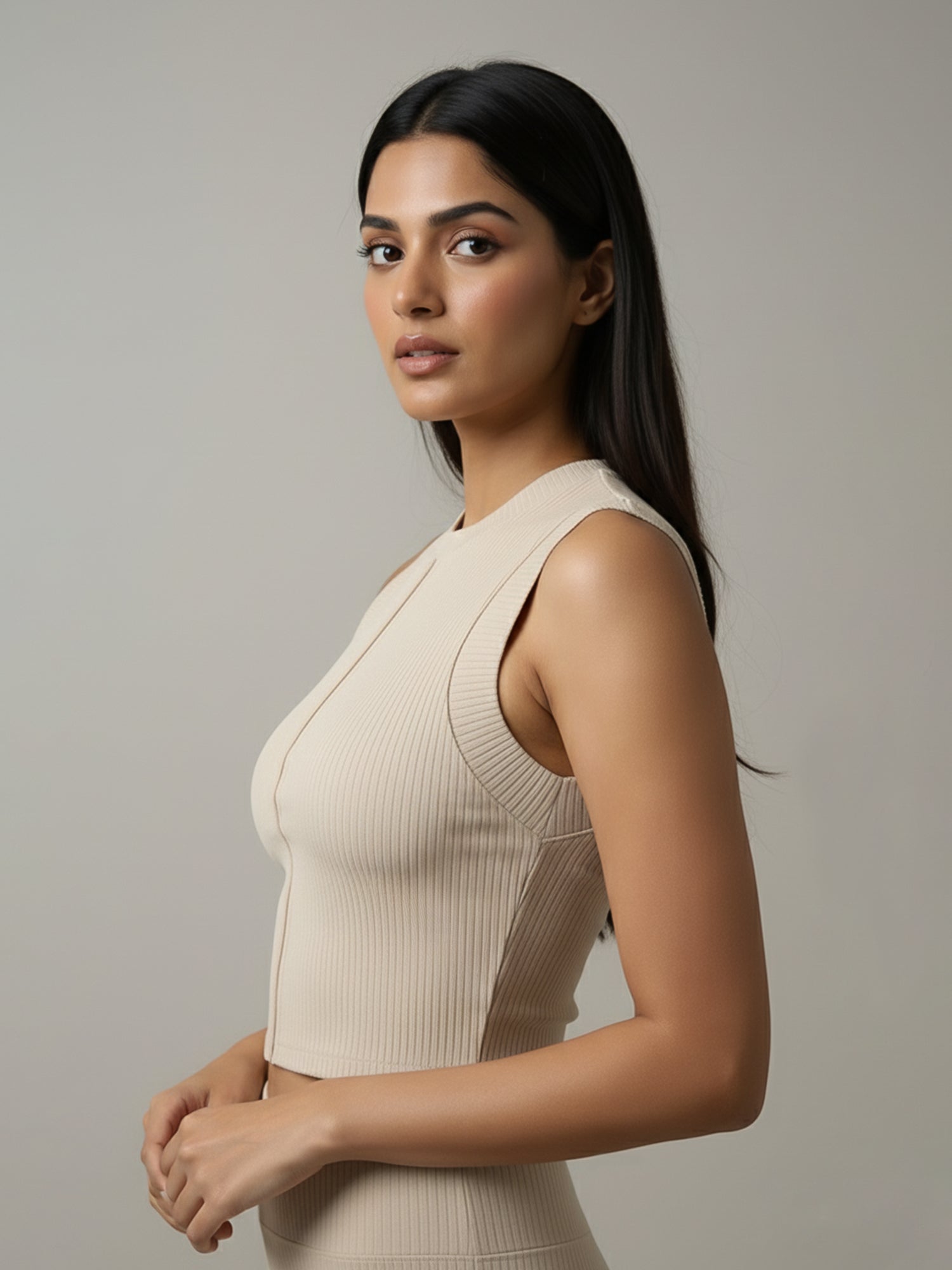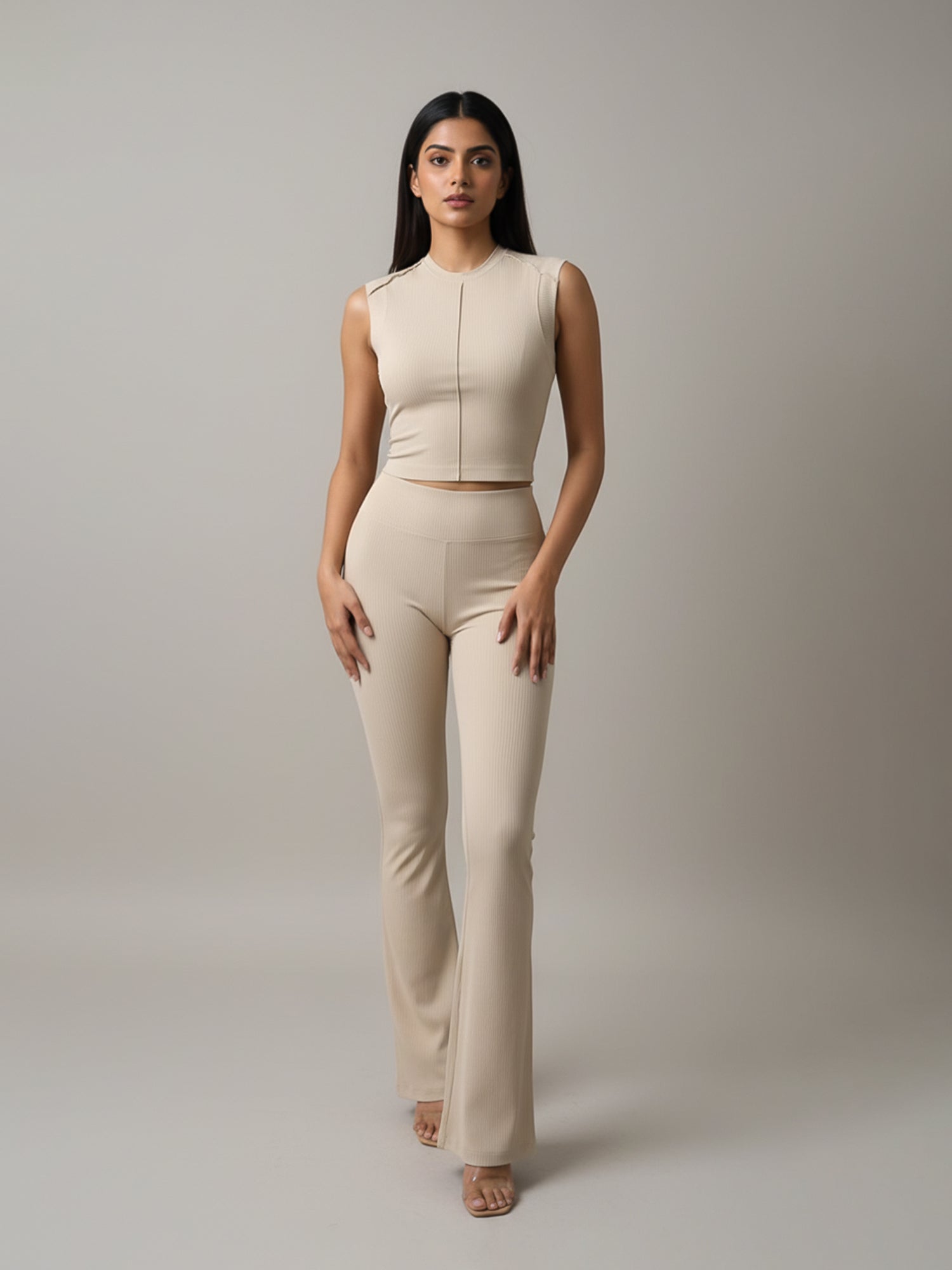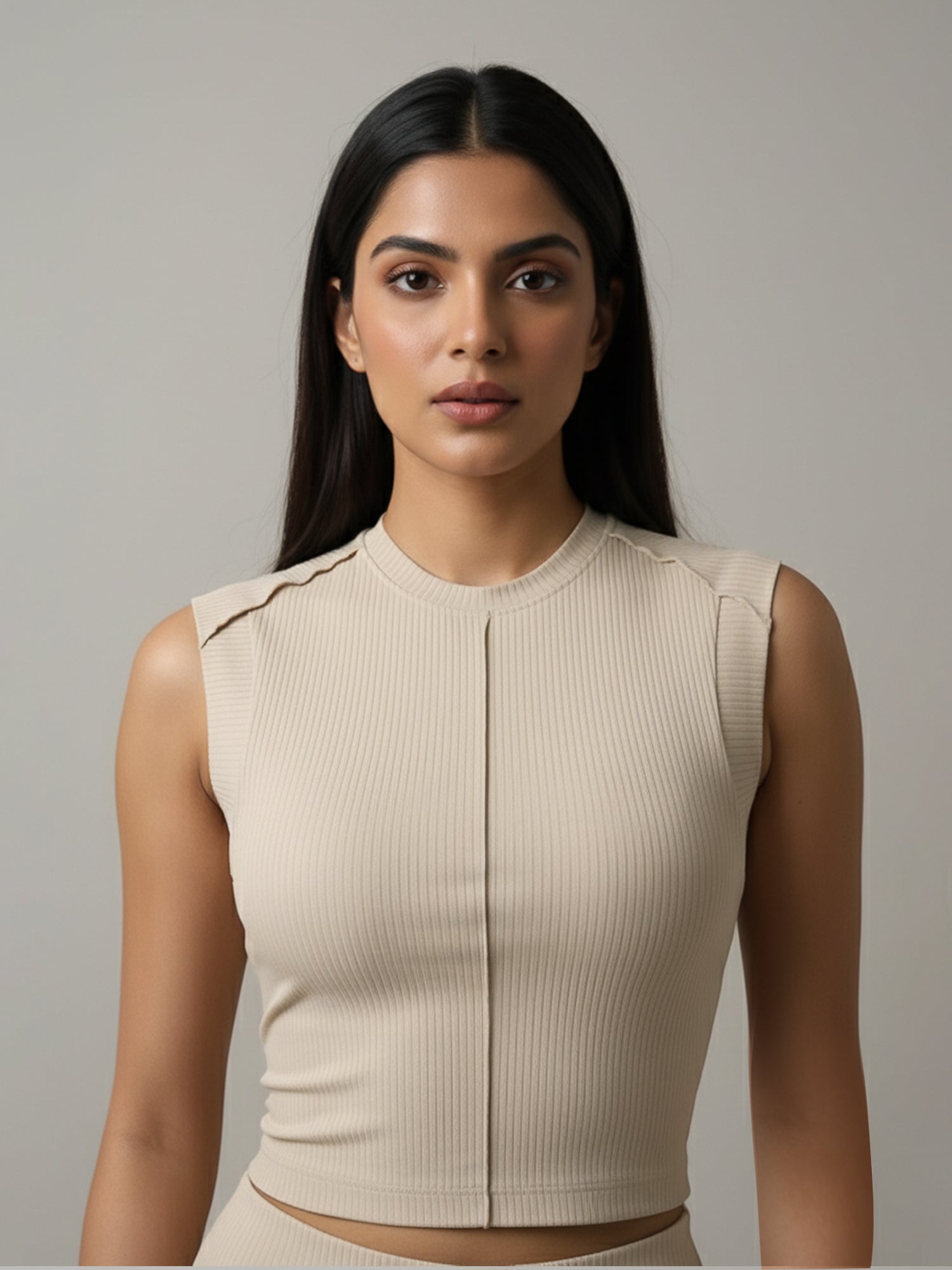 Keep it cute and comfy in our Beige Ribbed Sleeveless Crop Top! Made with soft ribbed fabric that hugs you just right, this crop top is your go-to for that effortlessly chic look. The front seam detail adds a touch of edge, while the cropped fit keeps it trendy and versatile — perfect for brunches, workouts, or chilling with your besties.