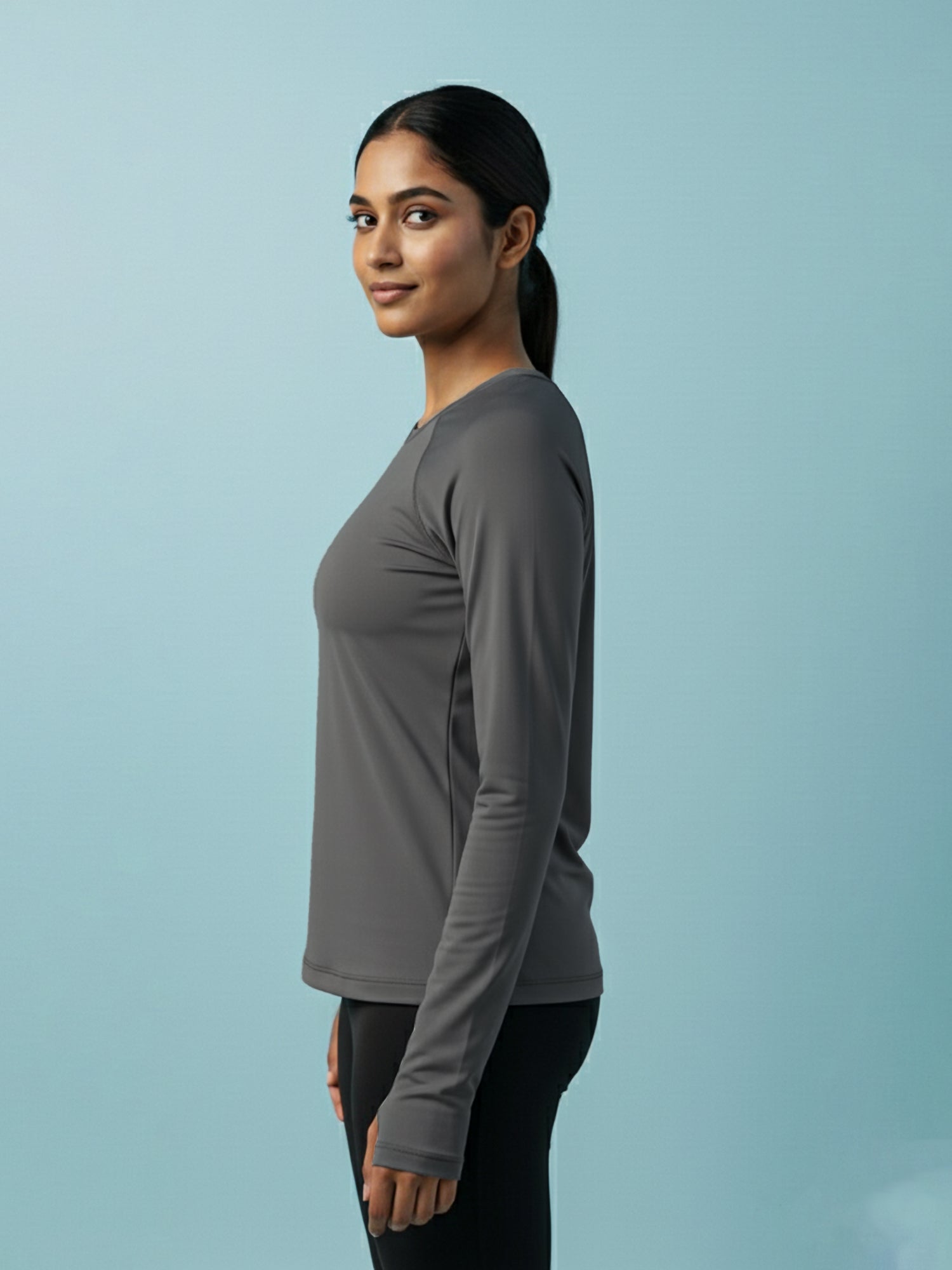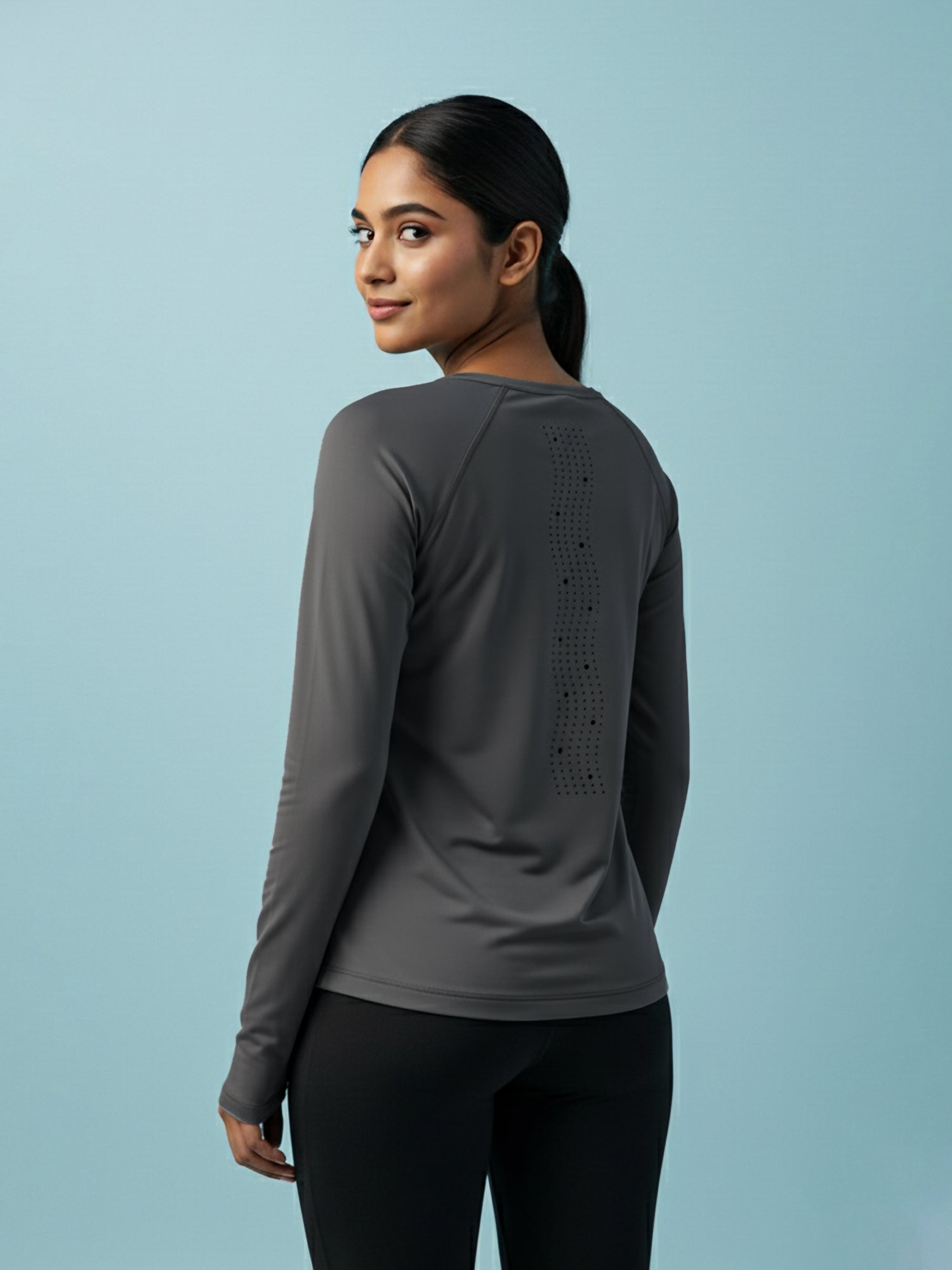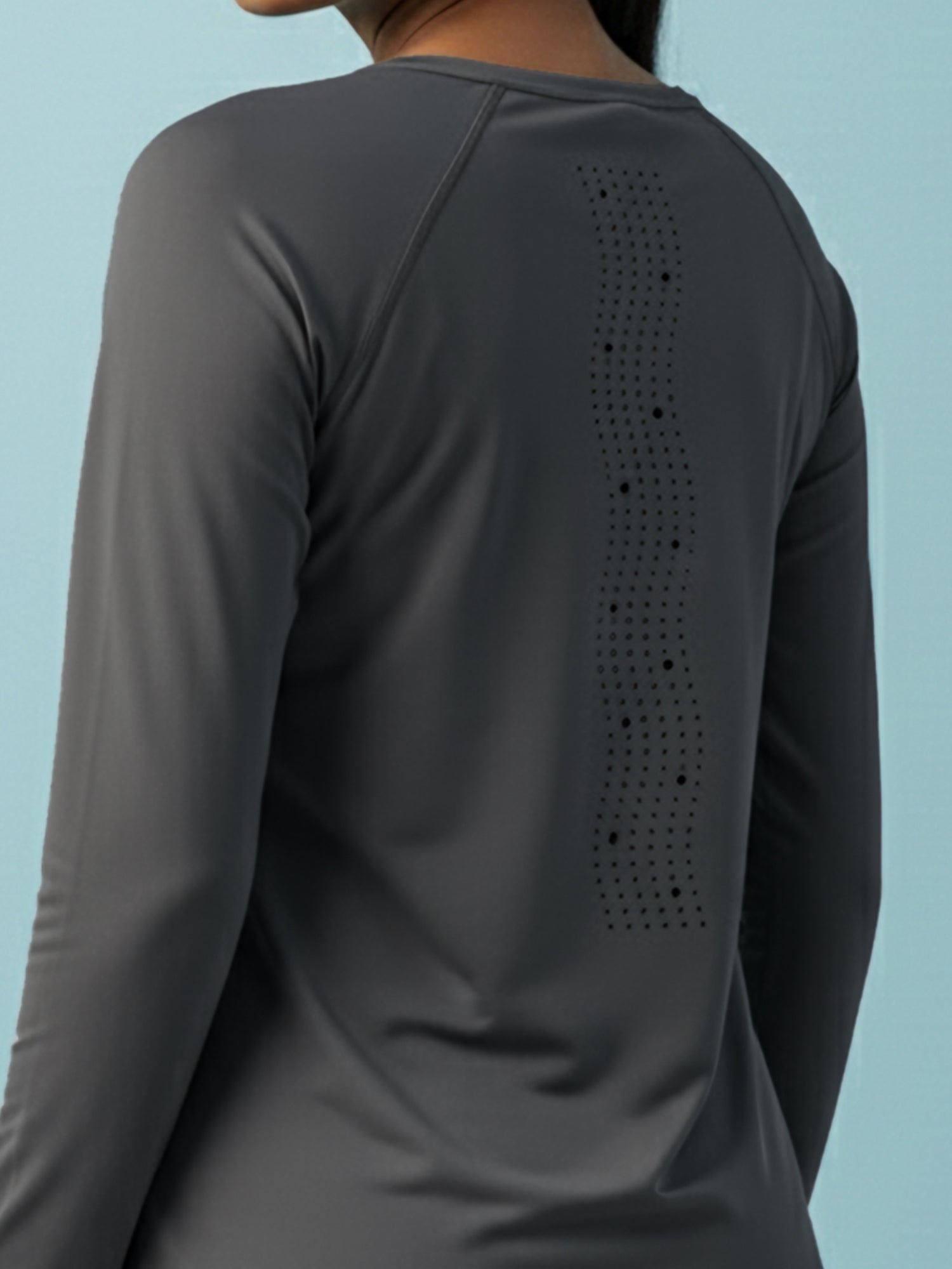 Lightweight grey workout tee with long raglan sleeves and thumbholes. Back laser-cut detailing adds extra ventilation, while the curved hem gives easy, flattering coverage over tights.