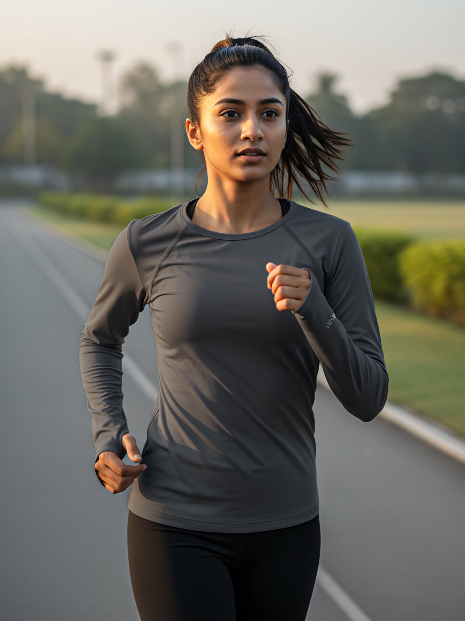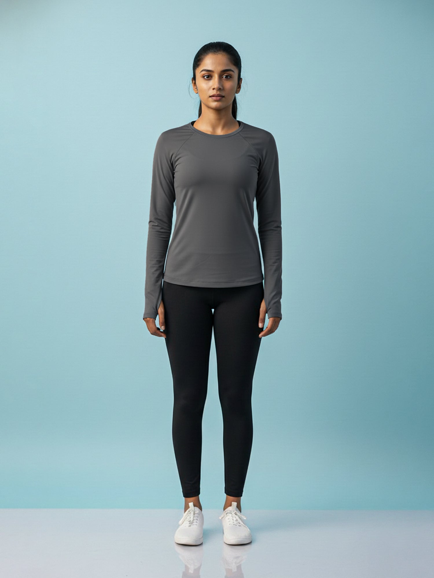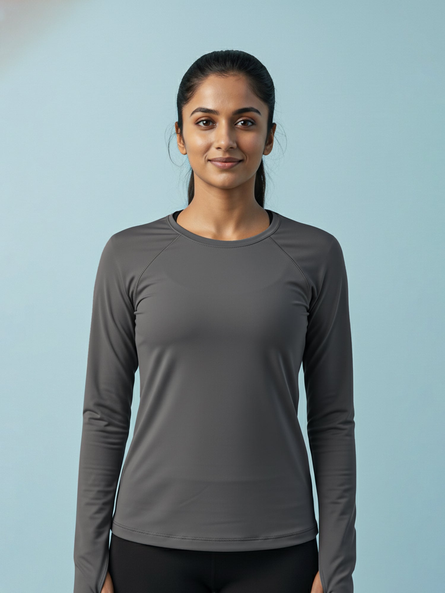 Lightweight grey workout tee with long raglan sleeves and thumbholes. Back laser-cut detailing adds extra ventilation, while the curved hem gives easy, flattering coverage over tights.