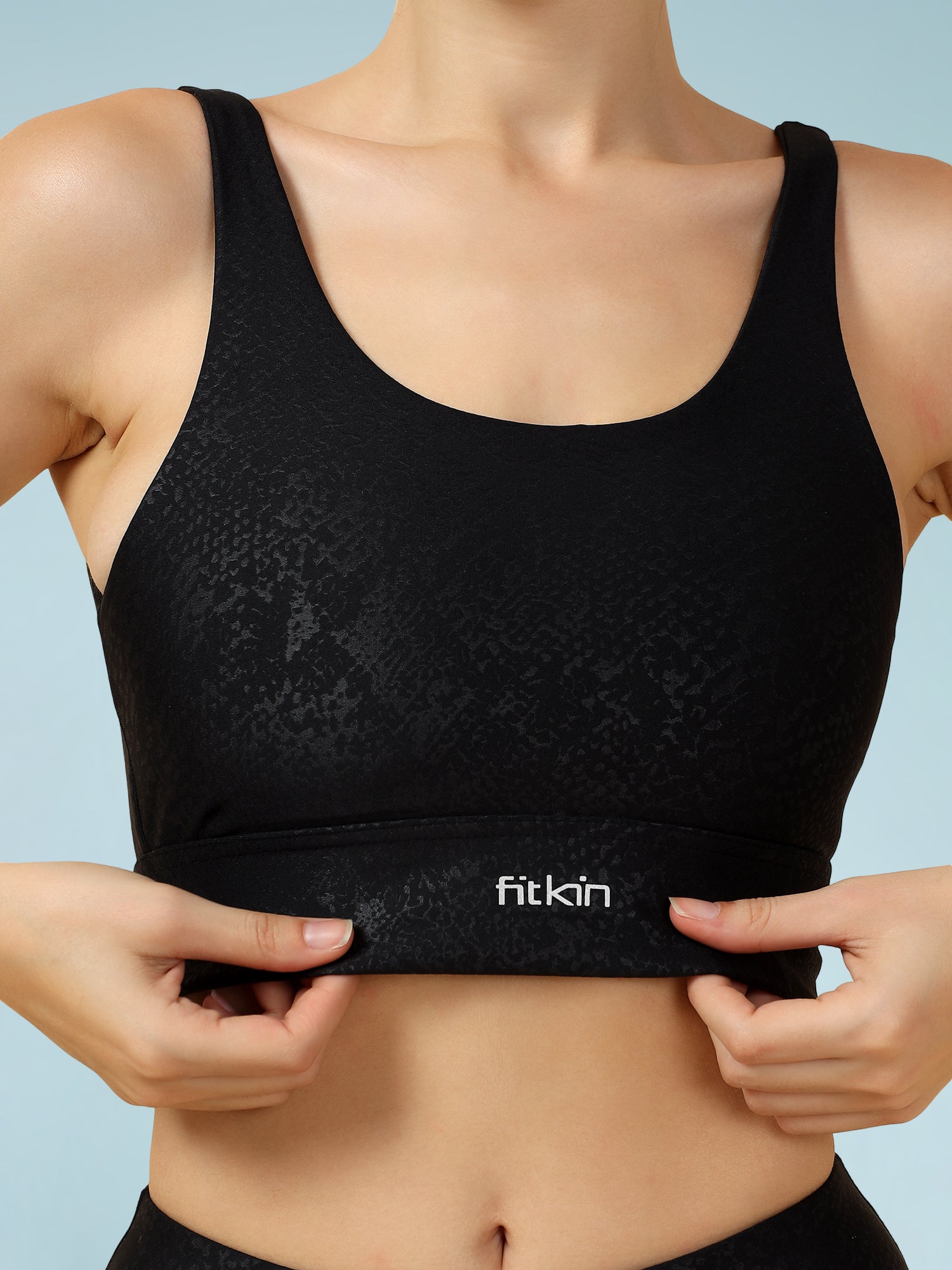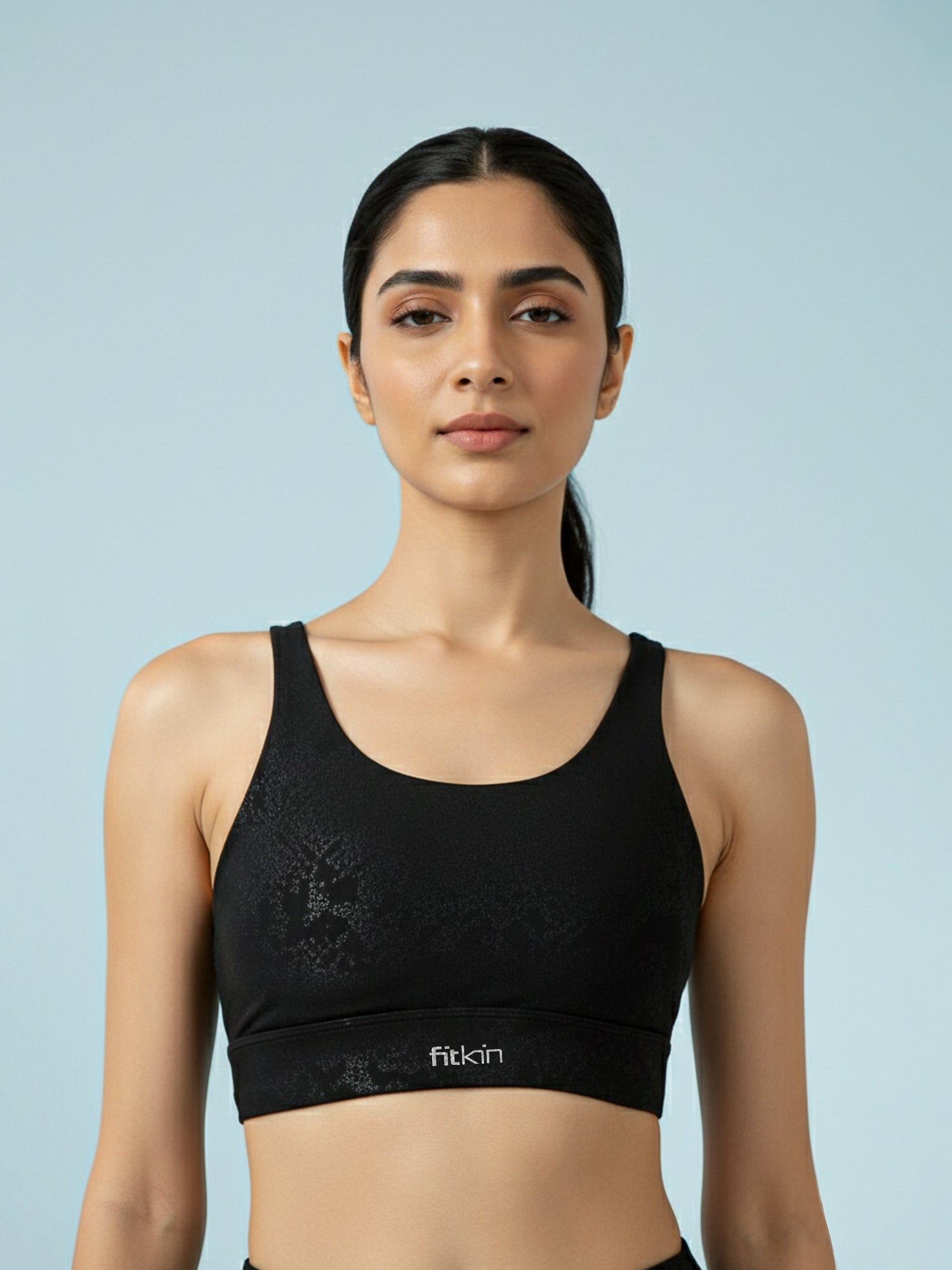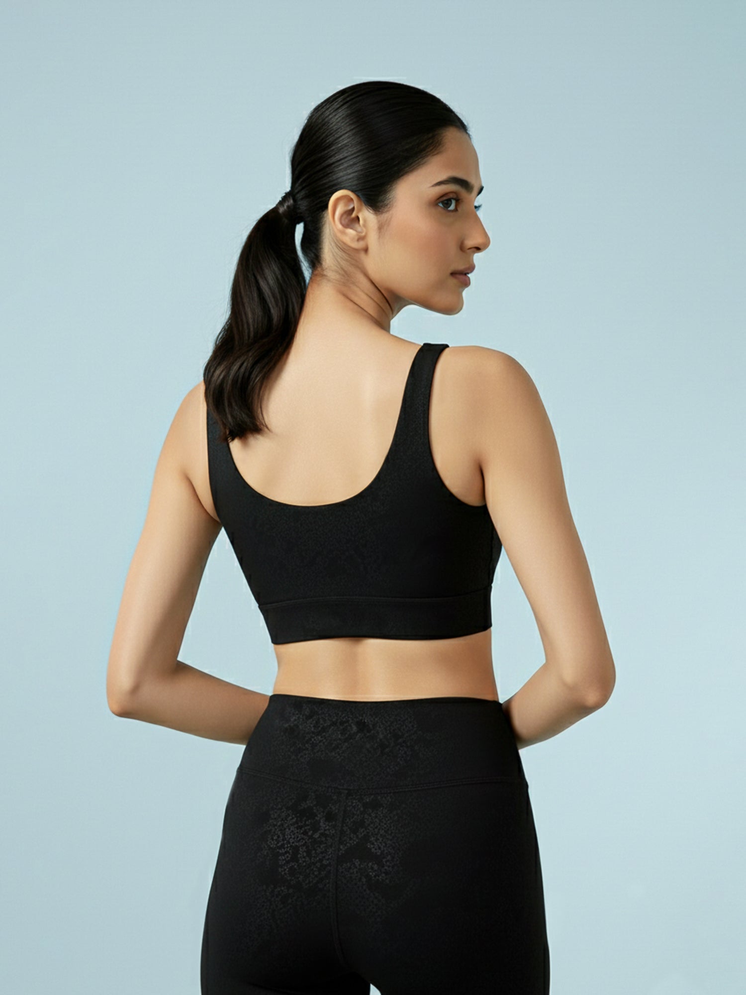 Sleek. Subtle. Strong. This black snake print sports bra combines understated texture with high-performance support. Designed for medium-impact workouts, it delivers comfort, style, and a fierce edge.
