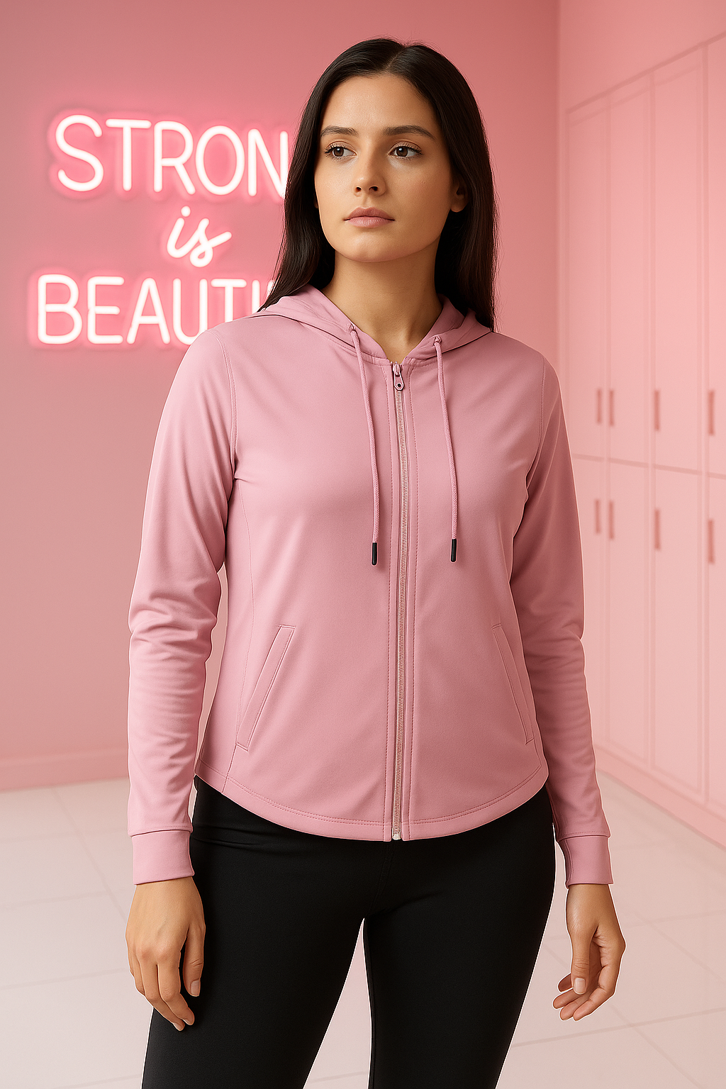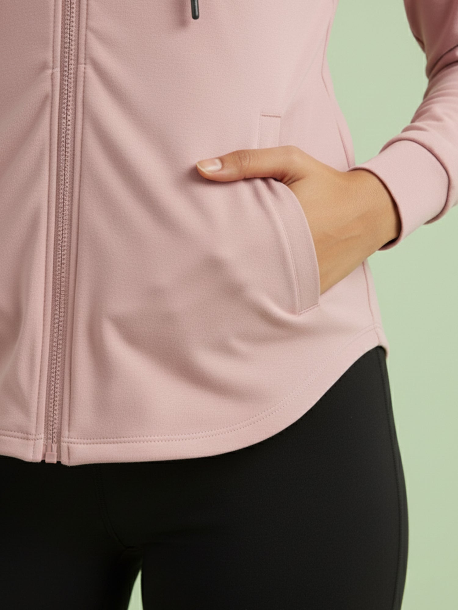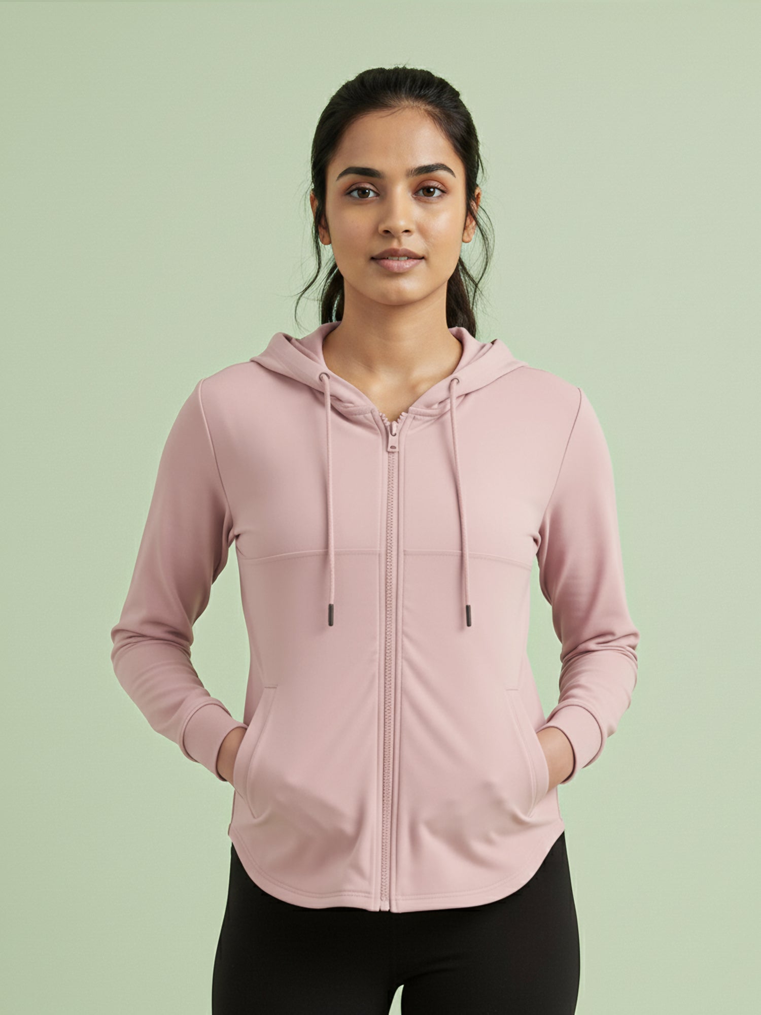 A soft blend of comfort and confidence — this pastel pink hoodie jacket is made for everything from warm-up sessions to coffee runs. Featuring a sleek front zipper, subtle self-texture, and functional side pockets, it pairs everyday ease with a refined, active look. The lightweight stretch fabric keeps you comfortable while maintaining its shape through every move.