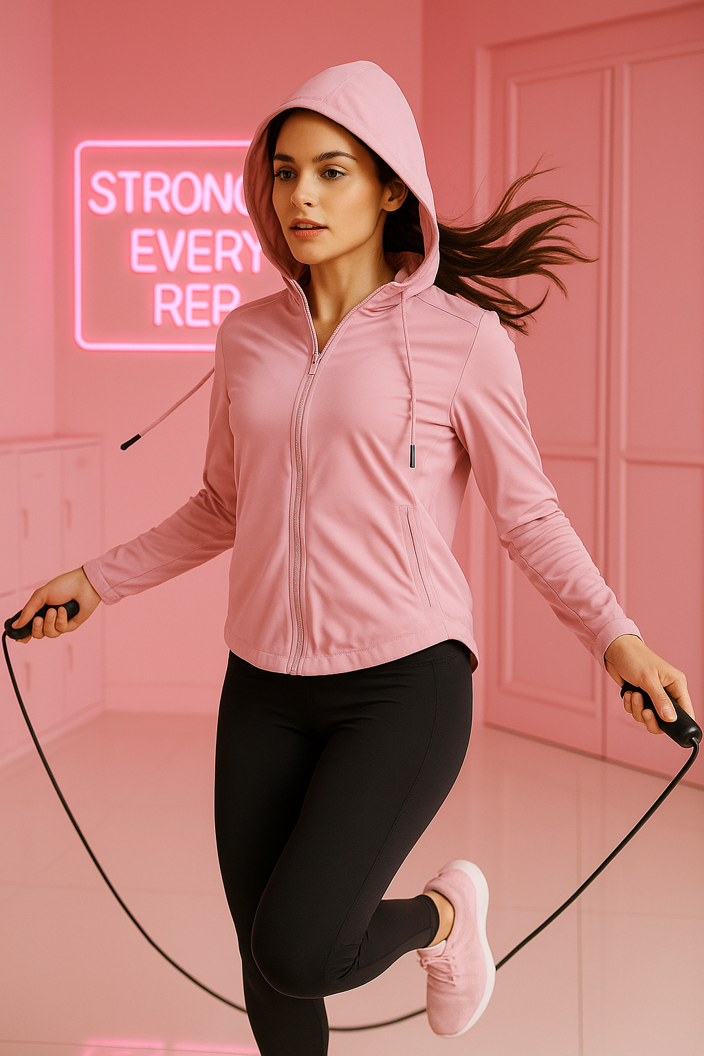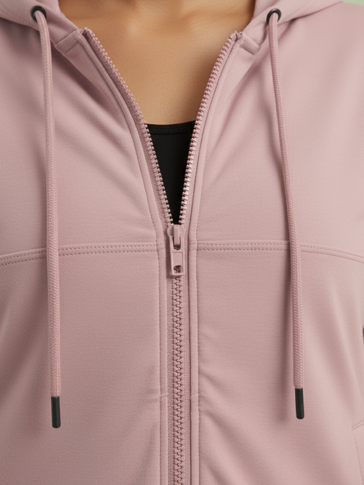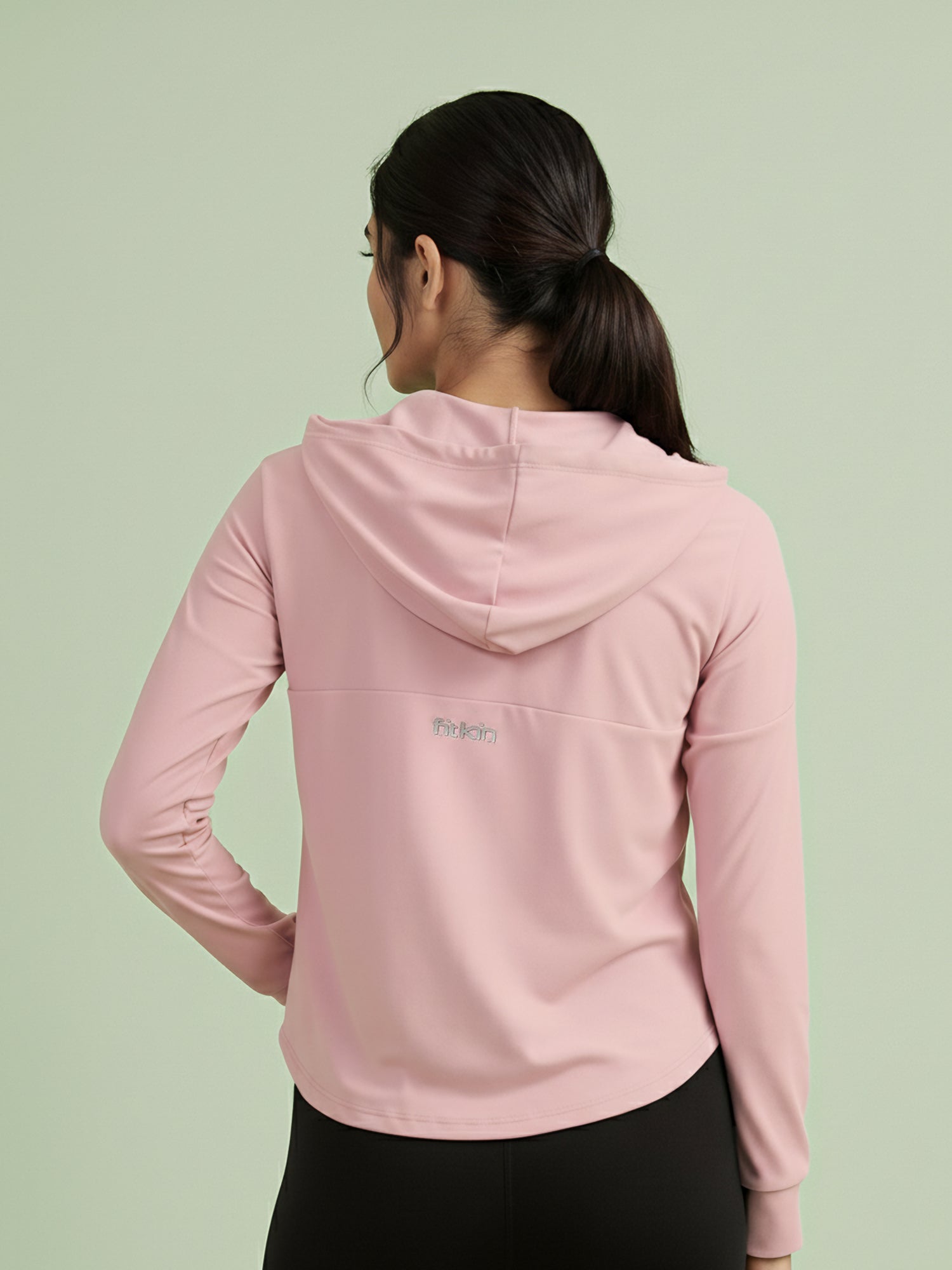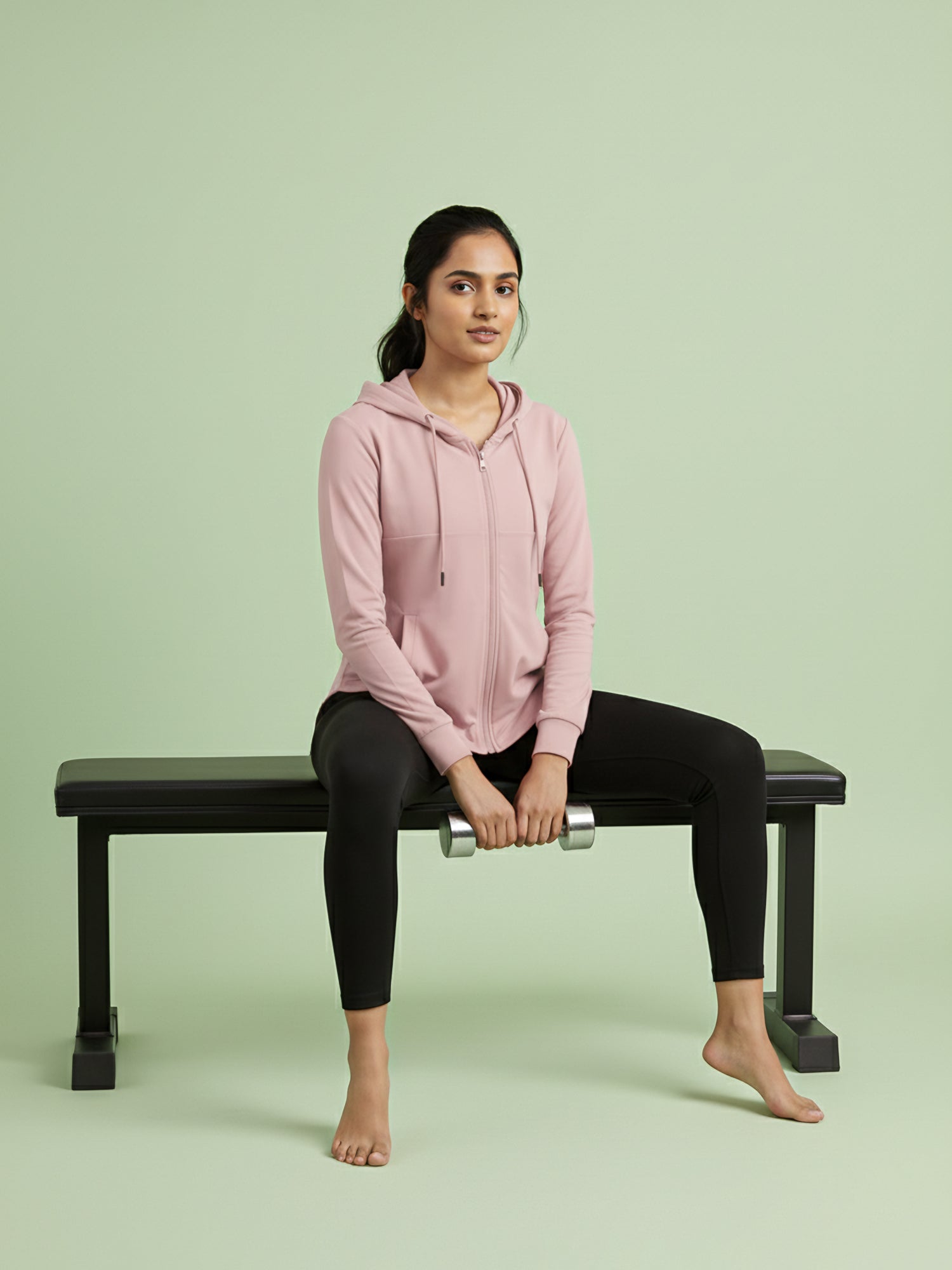 A soft blend of comfort and confidence — this pastel pink hoodie jacket is made for everything from warm-up sessions to coffee runs. Featuring a sleek front zipper, subtle self-texture, and functional side pockets, it pairs everyday ease with a refined, active look. The lightweight stretch fabric keeps you comfortable while maintaining its shape through every move.