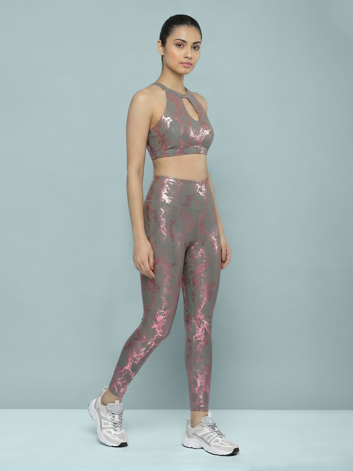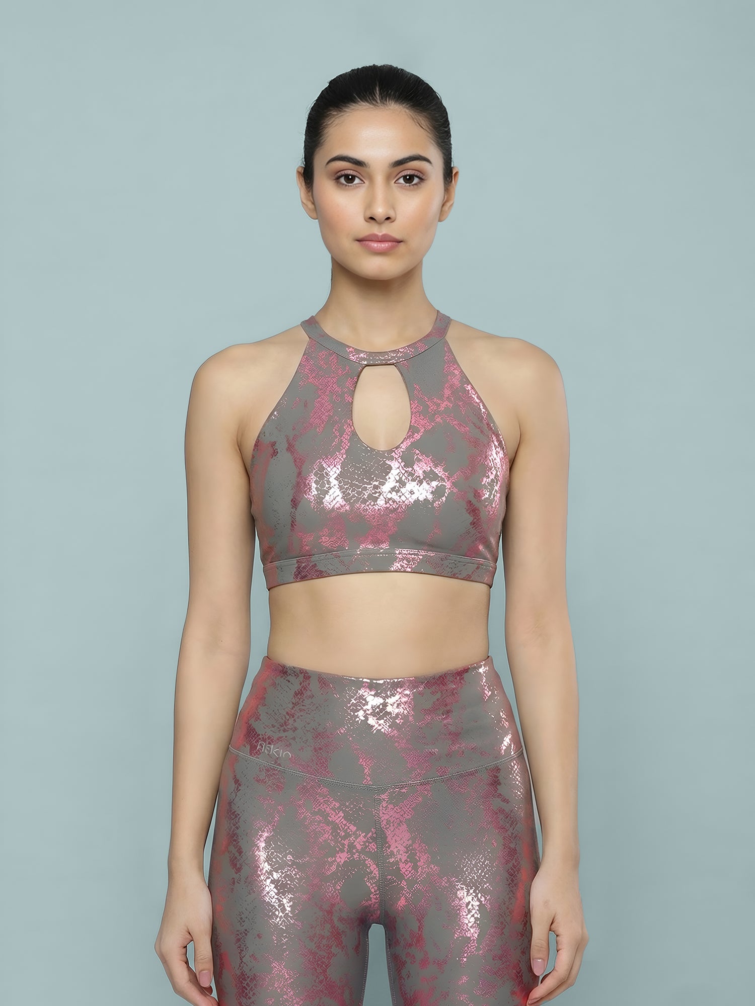 Elevate your workout wardrobe with this Printed High-Neck Sports Bra designed for both performance and style. Featuring a sleek halter neckline with a subtle front keyhole detail, it offers enhanced coverage with a modern edge. The bold all-over print adds a statement finish, making it perfect for confident athleisure looks.